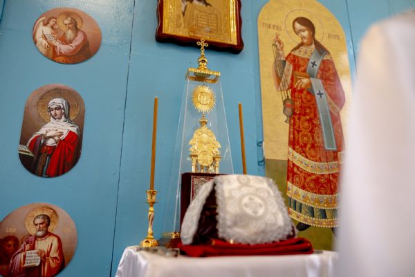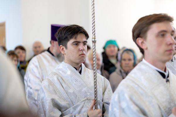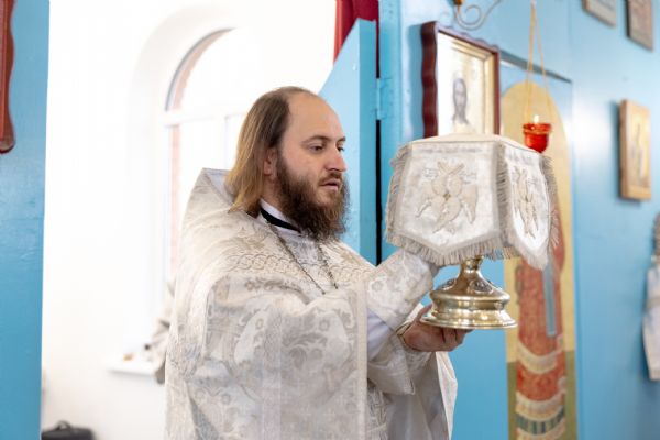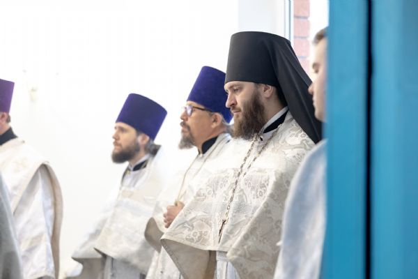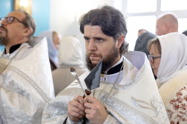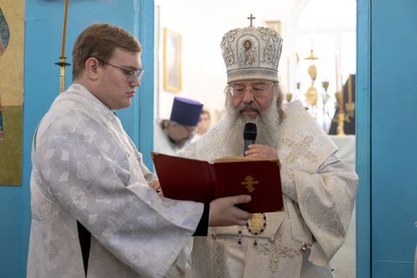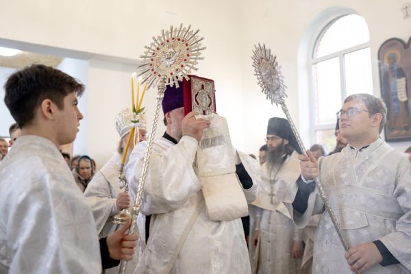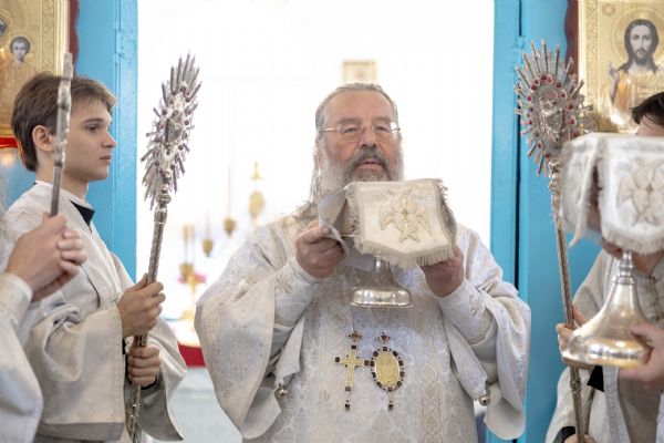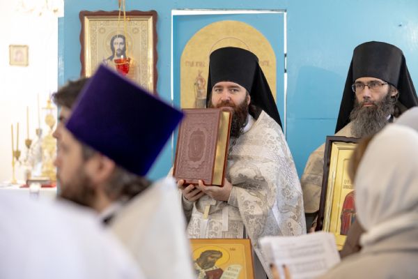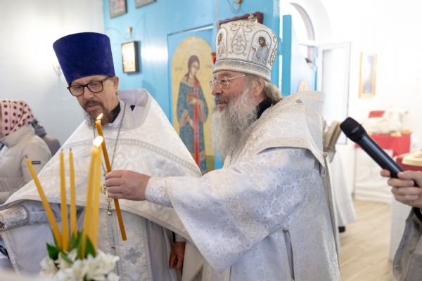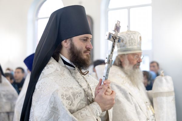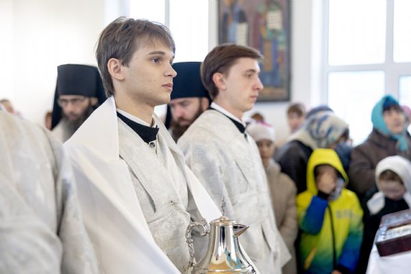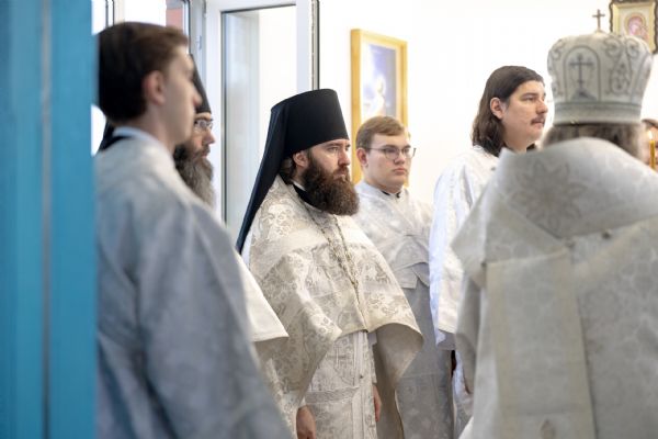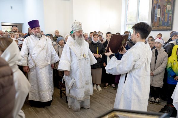 Митрополит Кирилл совершил в новоосвященном храме Божественную литургию. На мирной и сугубой ектениях были вознесены молитвы о Российском воинстве и о мире. По запричастном стихе проповедь произнёс игумен Алексий (Яцейко).