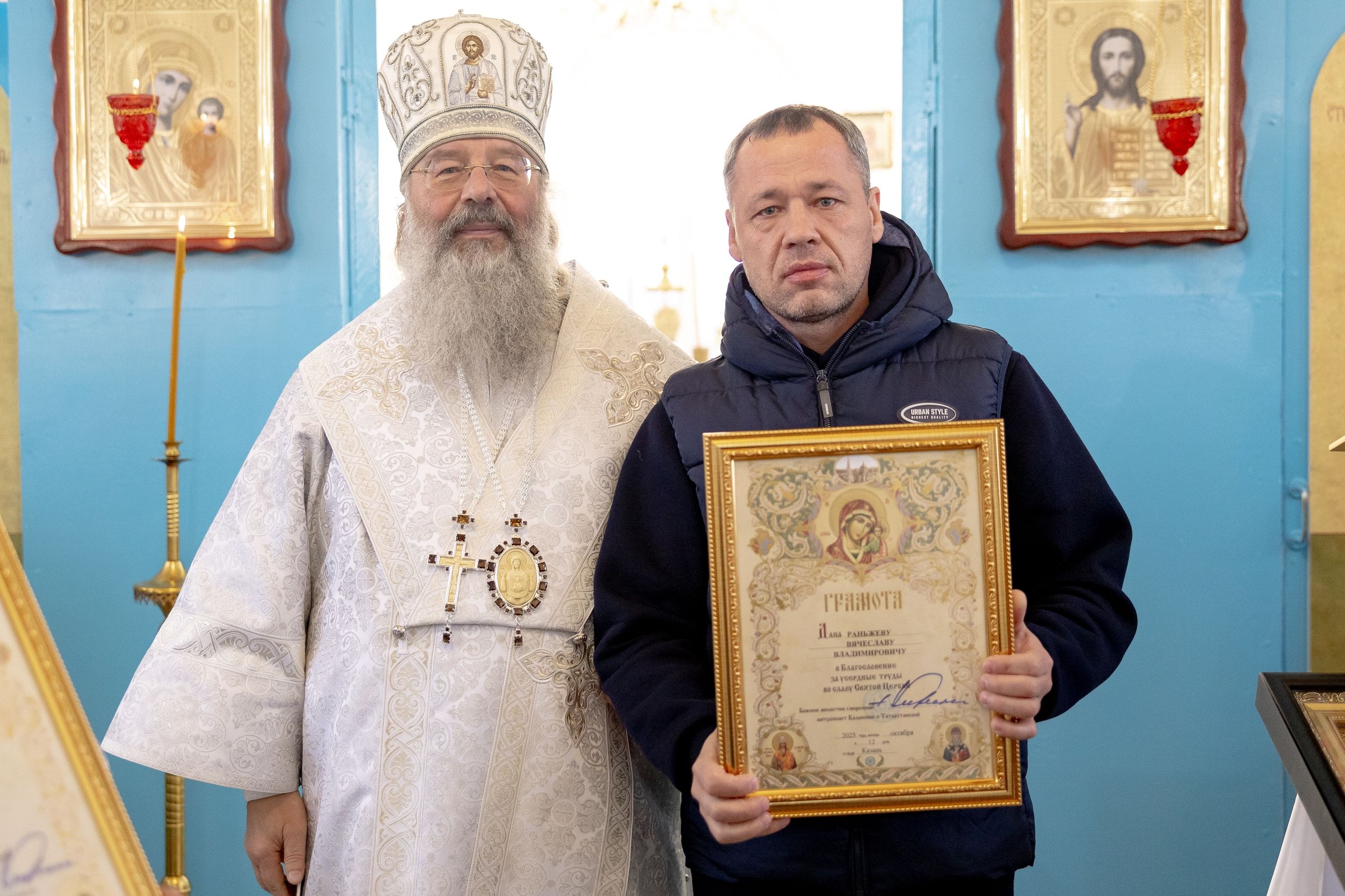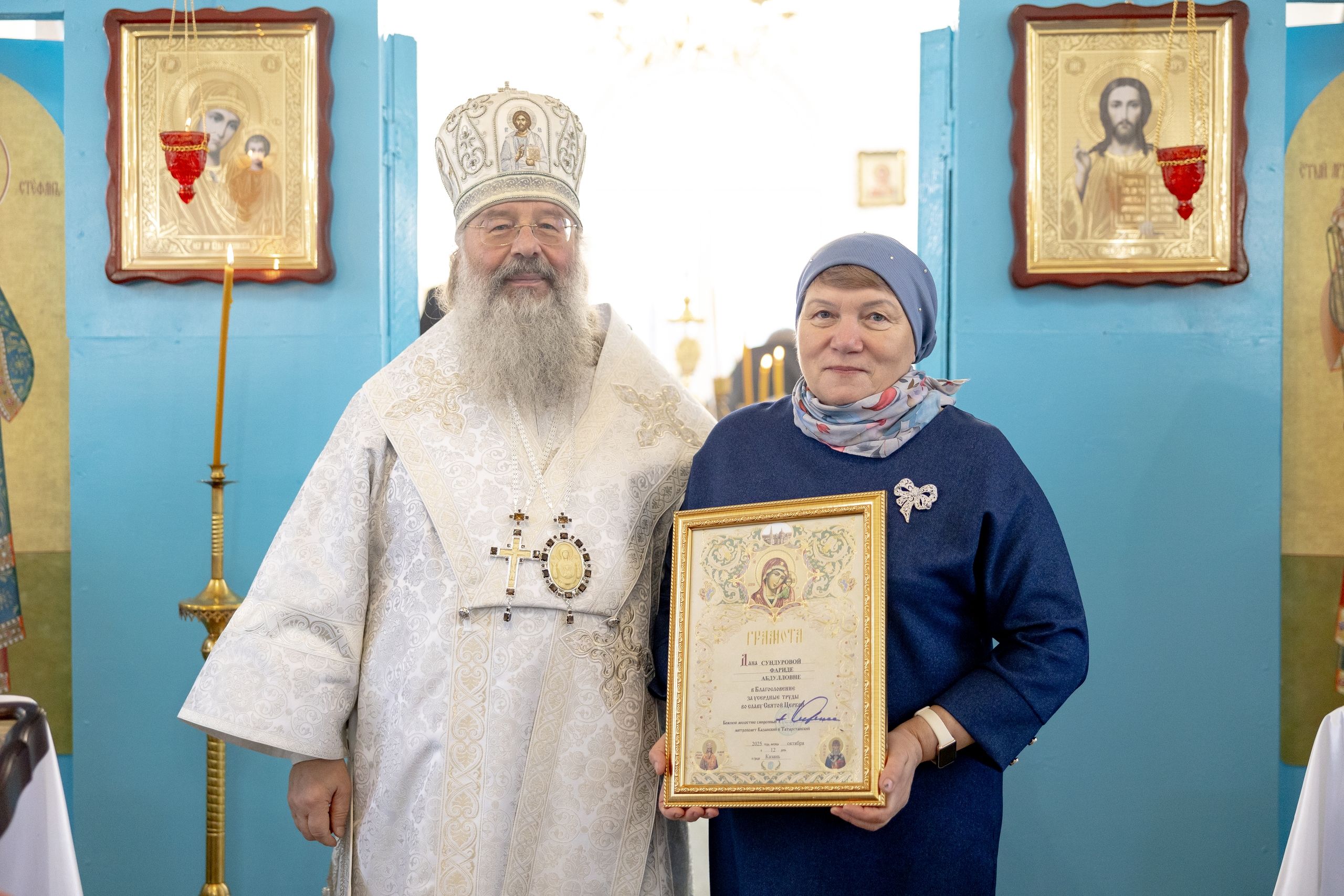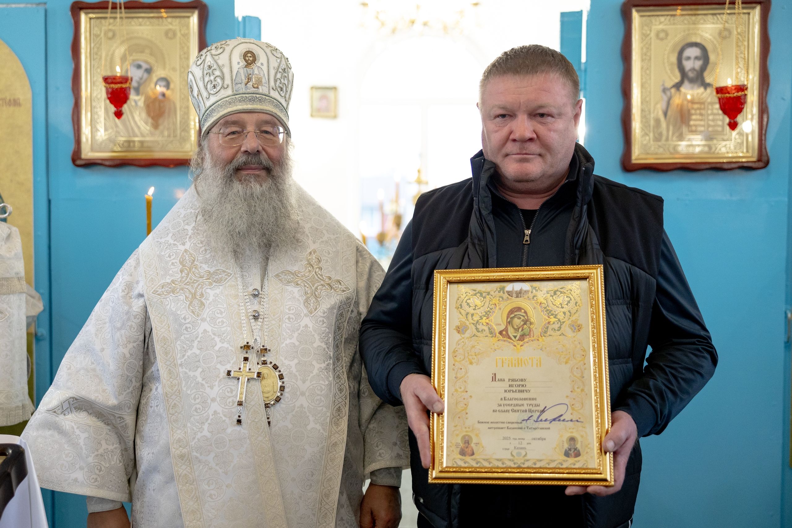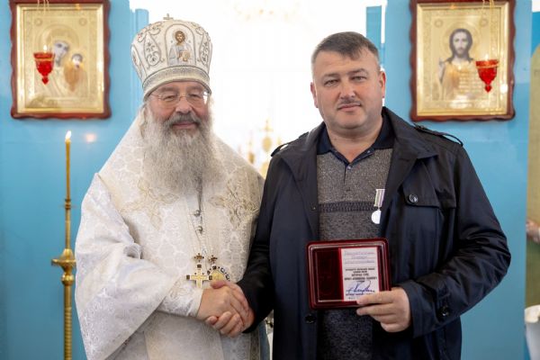 Затем глава Татарстанской митрополии вручил епархиальные награды мирянам, которые активно участвовали в строительстве храма.