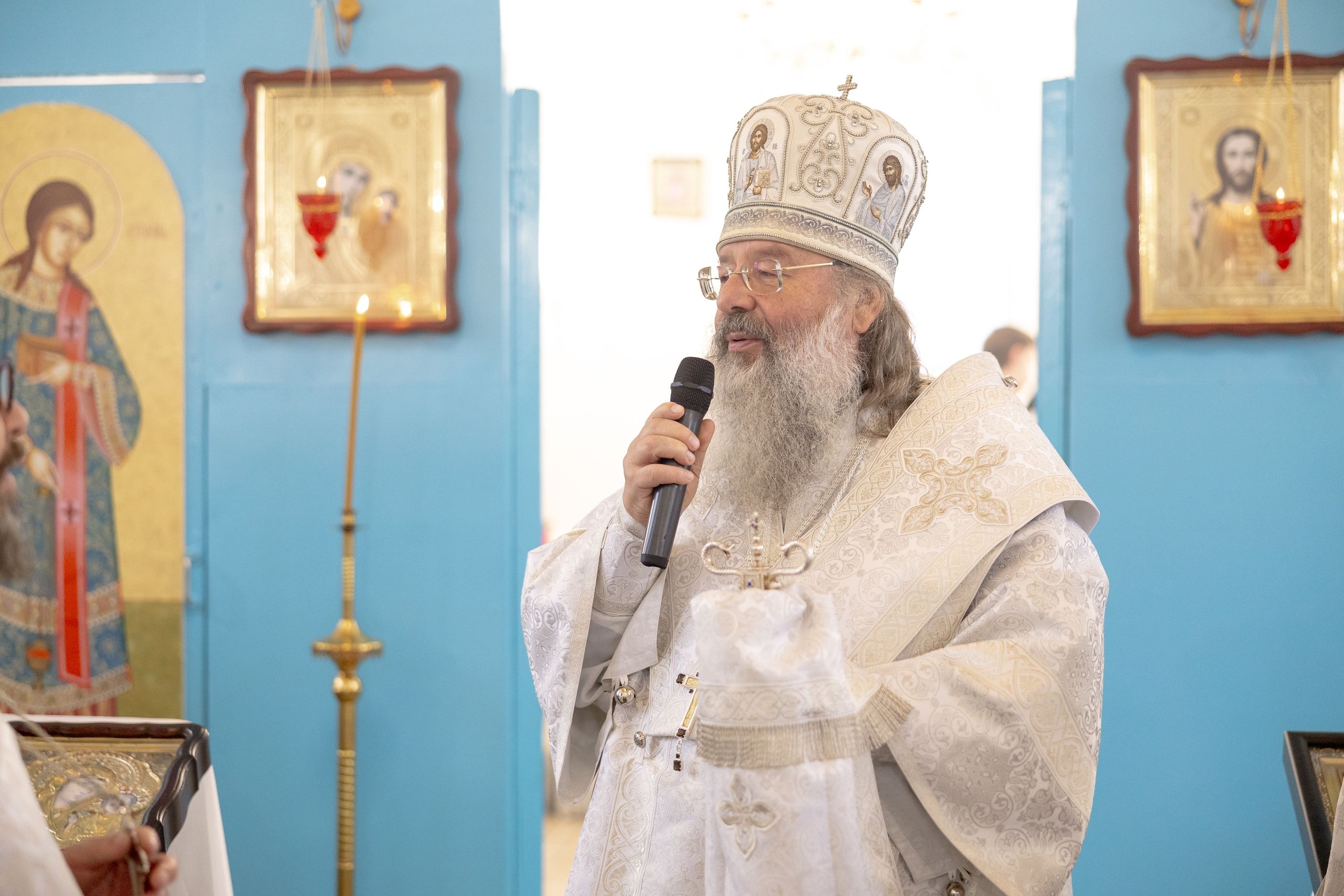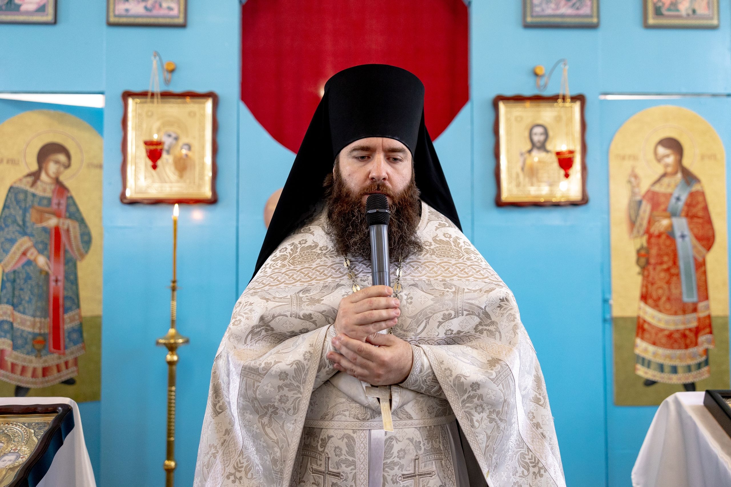 Дорогие братья и сестры! Я очень рад молиться сегодня вместе с вами. Хорошо помню момент, когда отец Николай пришёл ко мне за благословением на строительство этого маленького храма. Такие храмы должны быть в каждом селе, где есть православные люди. У верующих должна быть возможность молиться в храме.
