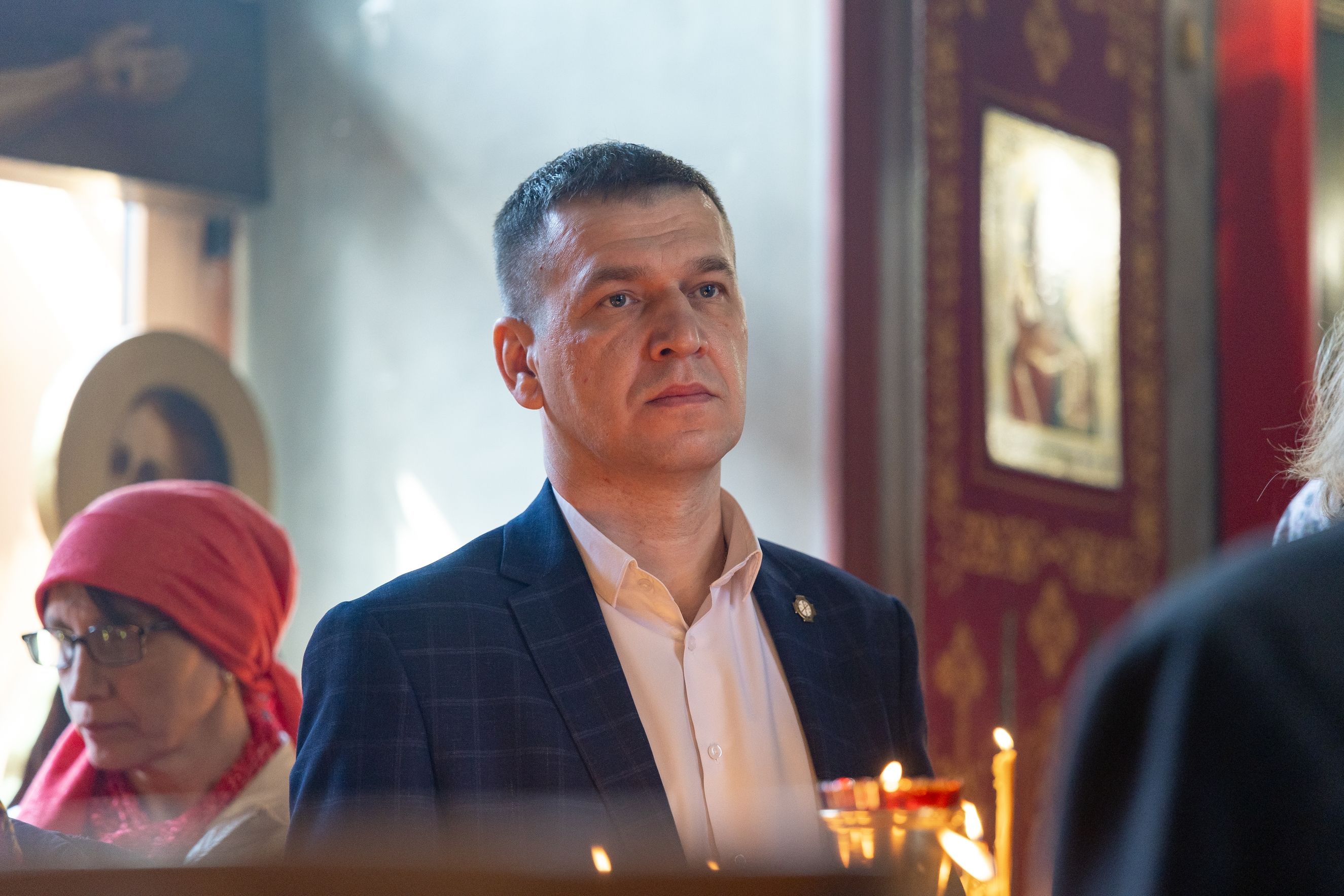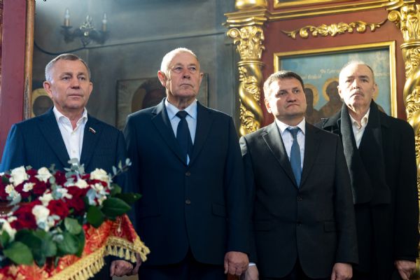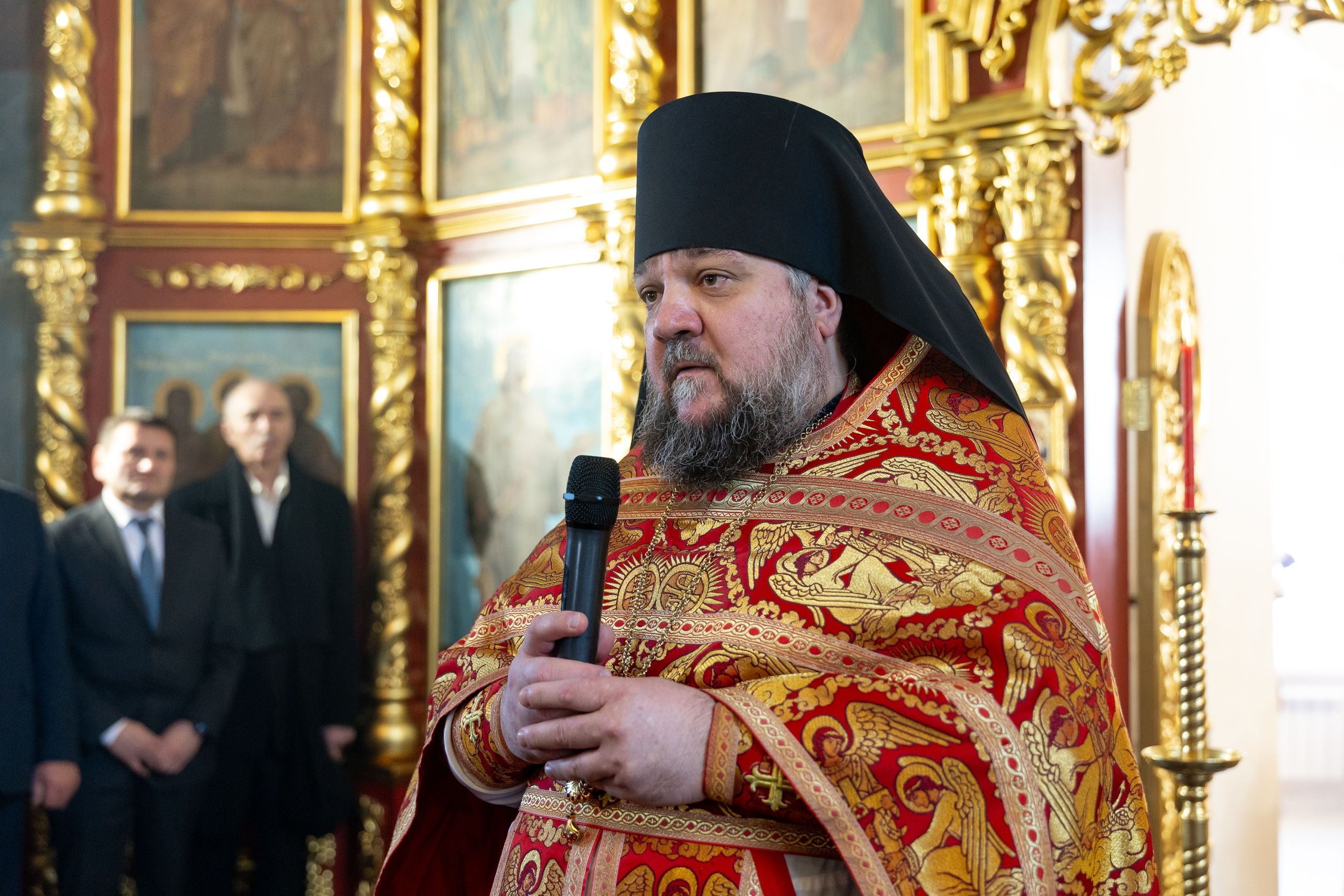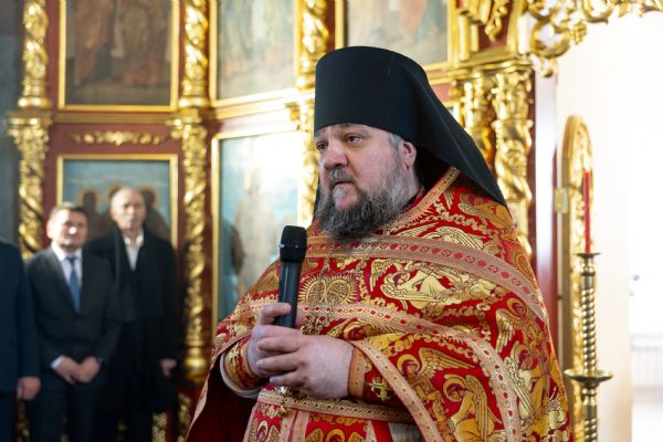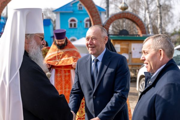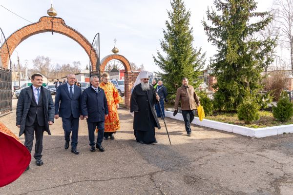 У входа в храм владыку Кирилла приветствовали глава Мамадышского муниципального района РТ Вадим Никитин и депутат районного совета Николай Егоров.