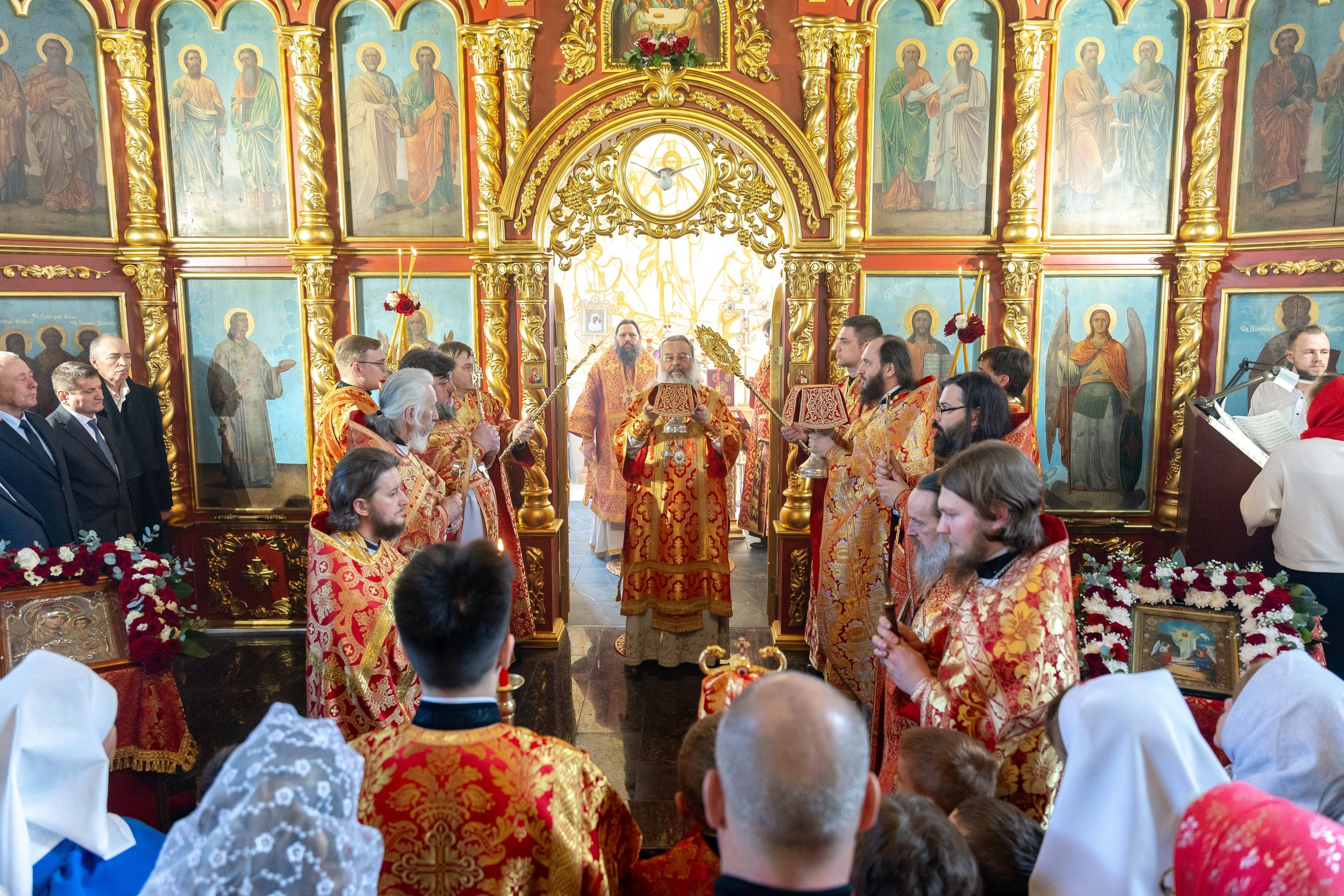 За Литургией архипастырям сослужили секретарь Татарстанской митрополии иеромонах Кирилл (Корытко), благочинный Мамадышского церковного округа Казанской епархии игумен Никодим (Шушмарченко), настоятель прихода иерей Олег Малышев, настоятель храма священномученика Вениамина Петроградского села Лельвиж протоиерей Леонид Прокопьев, настоятель храма первоверховных апостолов Петра и Павла села Соколка иерей Владимир Благоверный, насельник Иоанно-Предтеченского монастыря города Казани иеромонах Платон (Моисеев).