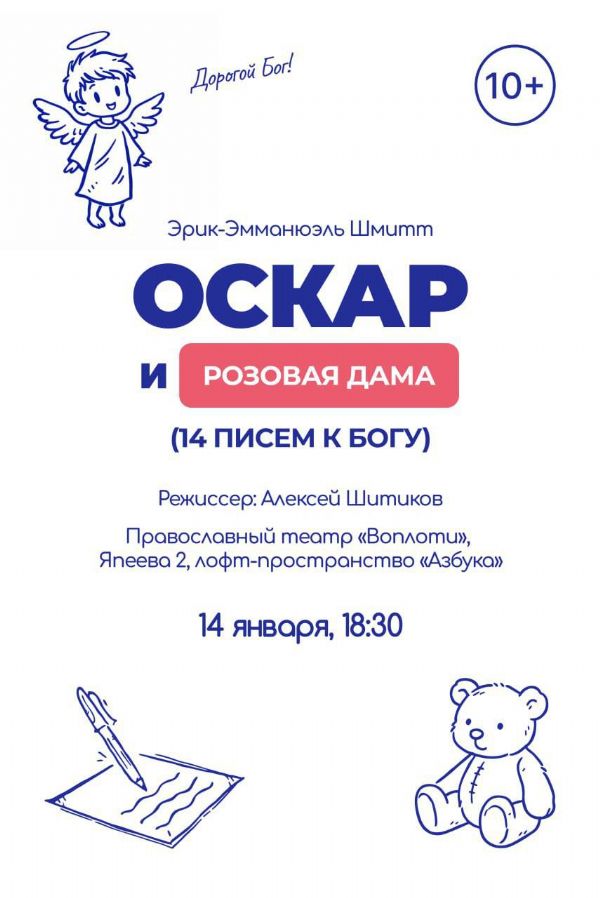 14 января в молодёжном пространстве «Азбука» состоится премьерный показ спектакля «Оскар и Розовая дама» или «14 писем к Богу» по пьесе Эрика-Эммануэля Шмитта. Постановку представит творческий коллектив православной молодёжи (руководитель Алексей Шитиков). Начало в 18.30. Вход свободный.