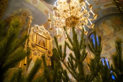 По отпусте Литургии из алтаря на середину храма архипастырь вынес икону Рождества Христова. Священнослужители пропели тропарь праздника «Рождество Твое, Христе Боже наш…» и кондак праздника «Дева днесь Пресущественнаго раждает…»