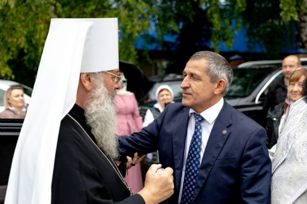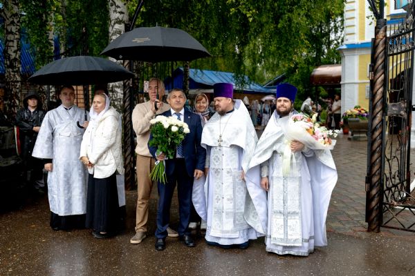 Перед началом богослужения у входа в храм архипастыря приветствовал глава Лаишевского муниципального района Ильдус Зарипов.