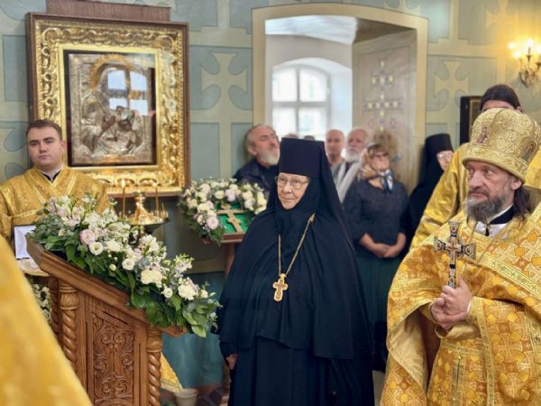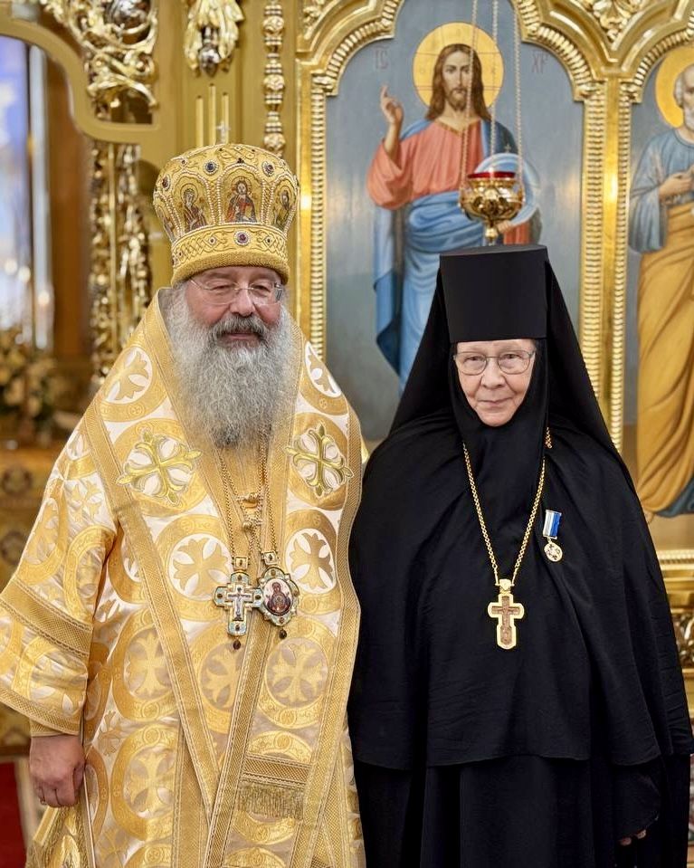 Владыка Кирилл тепло поздравил игумению Евстолию с наступившим 70-летием со дня рождения. Архипастырь вручил настоятельнице обители медаль Казанской иконы Божией Матери и передал в дар наперсный крест с украшениями.