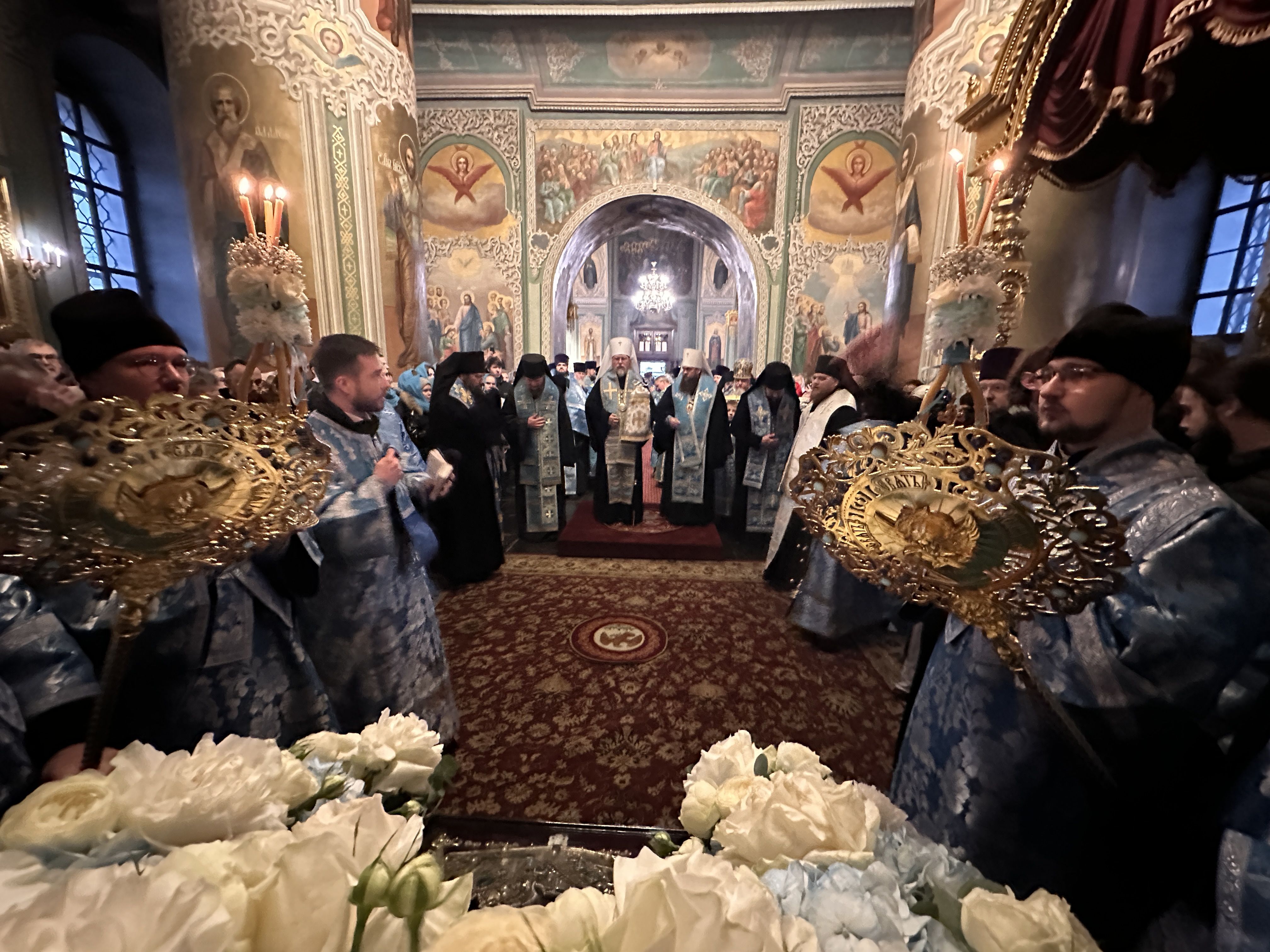 Казанская икона Божией Матери была внесена в воссозданный Казанский кафедральный собор. После принесения святыни на место её обретения в Казанском соборе началось служение Божественной литургии.