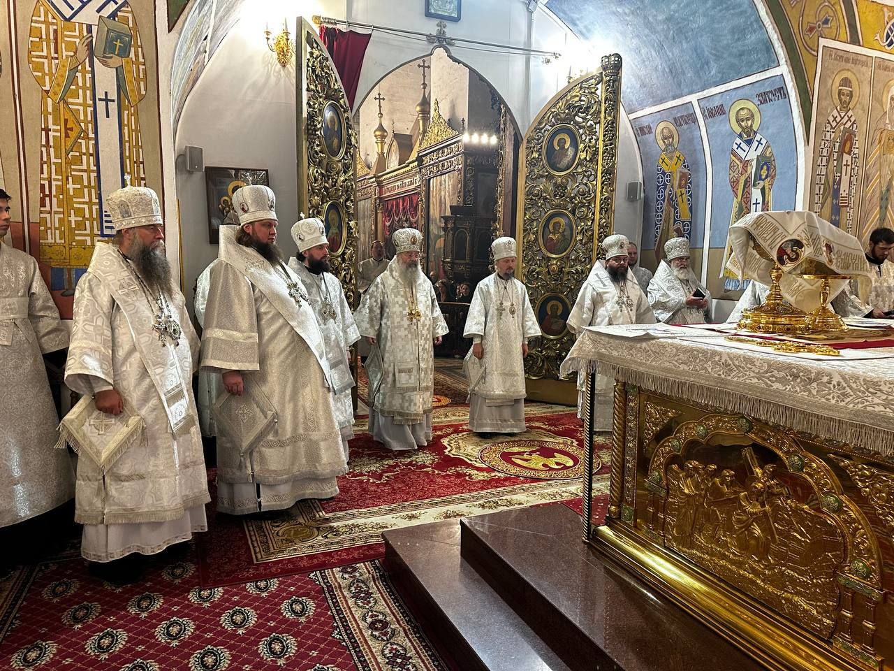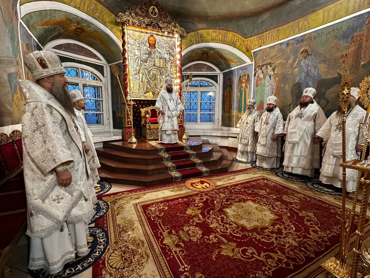 Архипастырям сослужили клирики разных епархий Русской Церкви. В числе сослуживших были секретарь Татарстанской митрополии иеромонах Кирилл (Корытко), настоятель Иоанно-Предтеченского монастыря города Казани игумен Алексий (Яцейко), клирик Казанского кафедрального собора протодиакон Симеон (Белецкий).