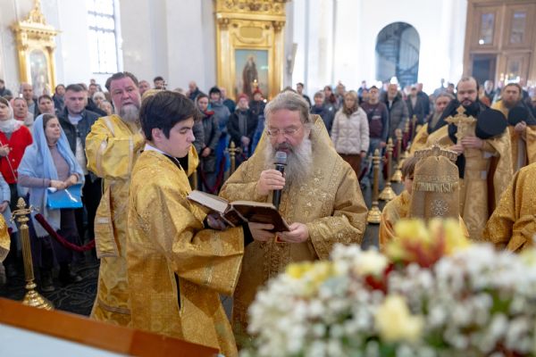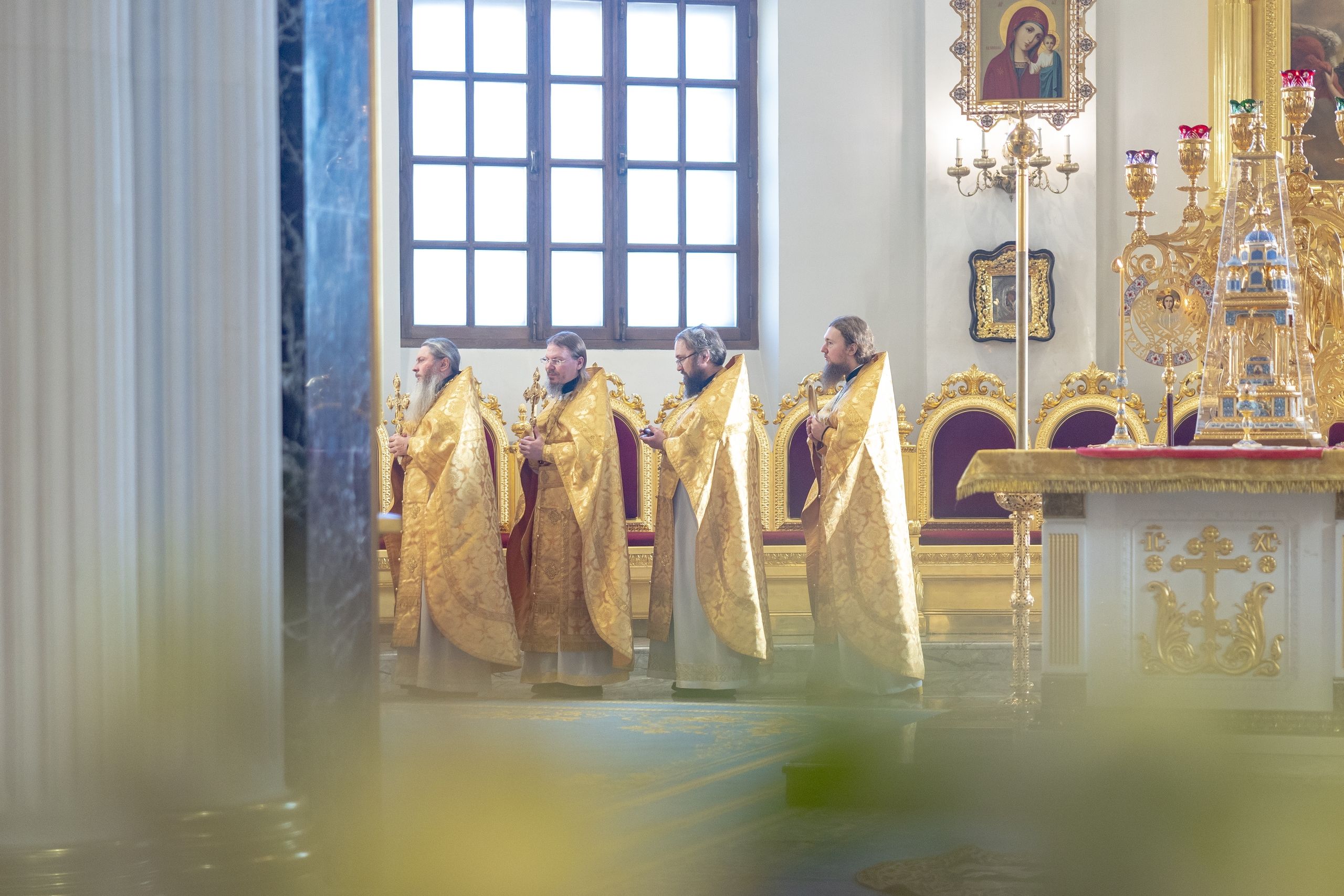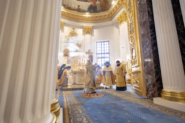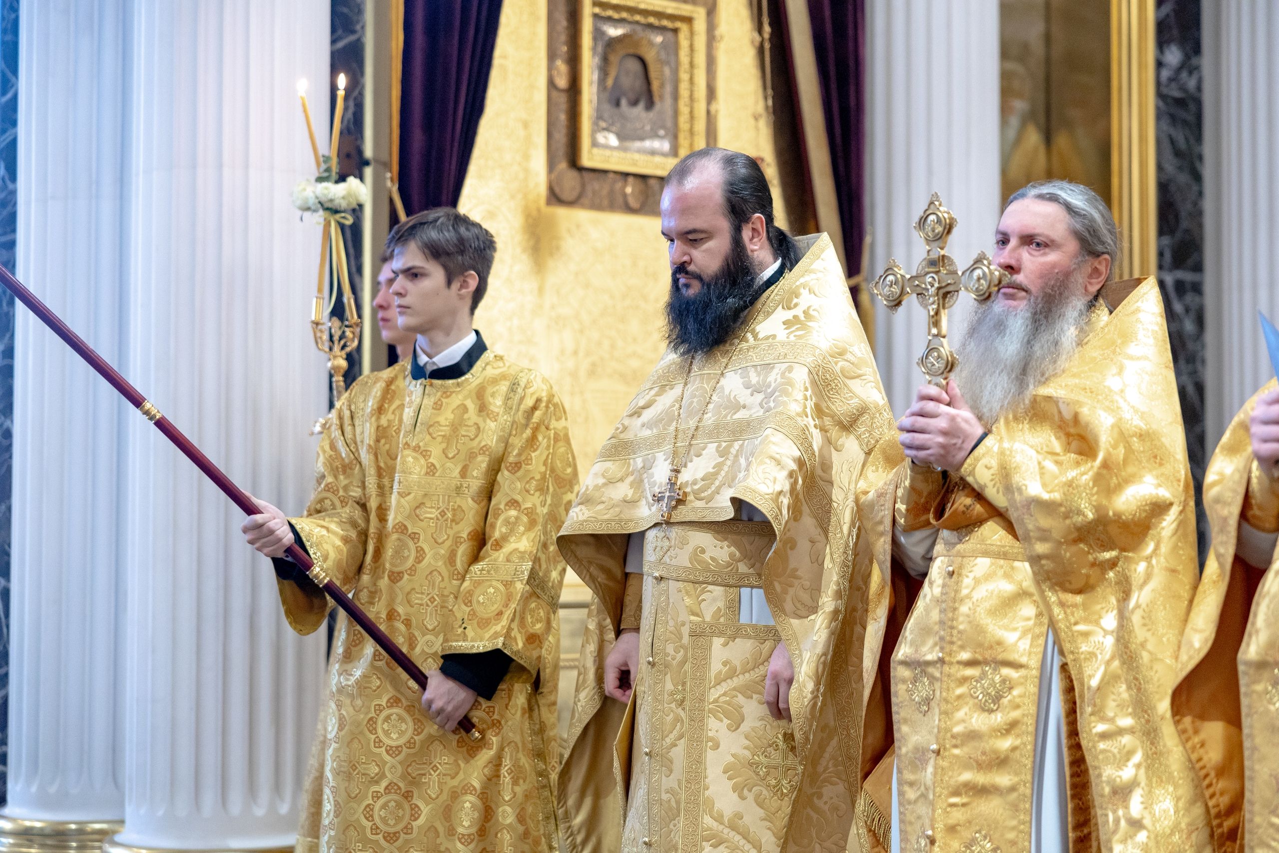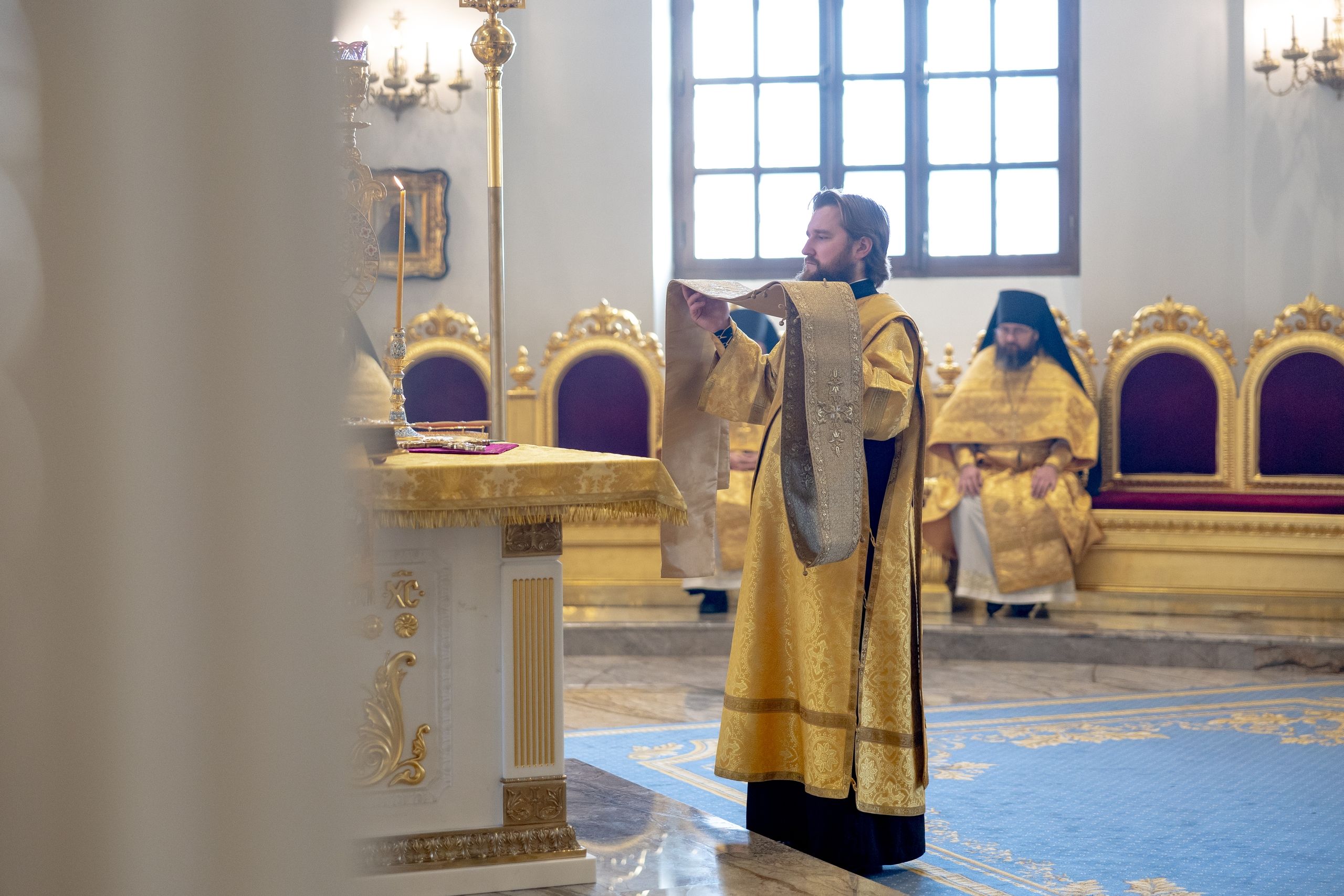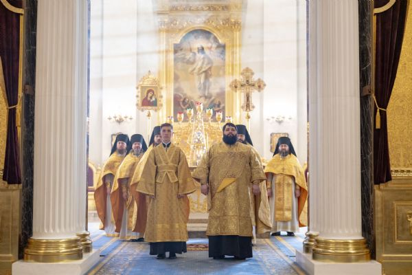 На мирной и сугубой ектениях были вознесены молитвенные прошения о Российском воинстве и о мире. По запричастном стихе проповедь произнёс иеромонах Гермоген (Рубан).