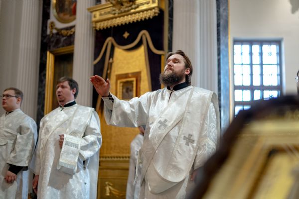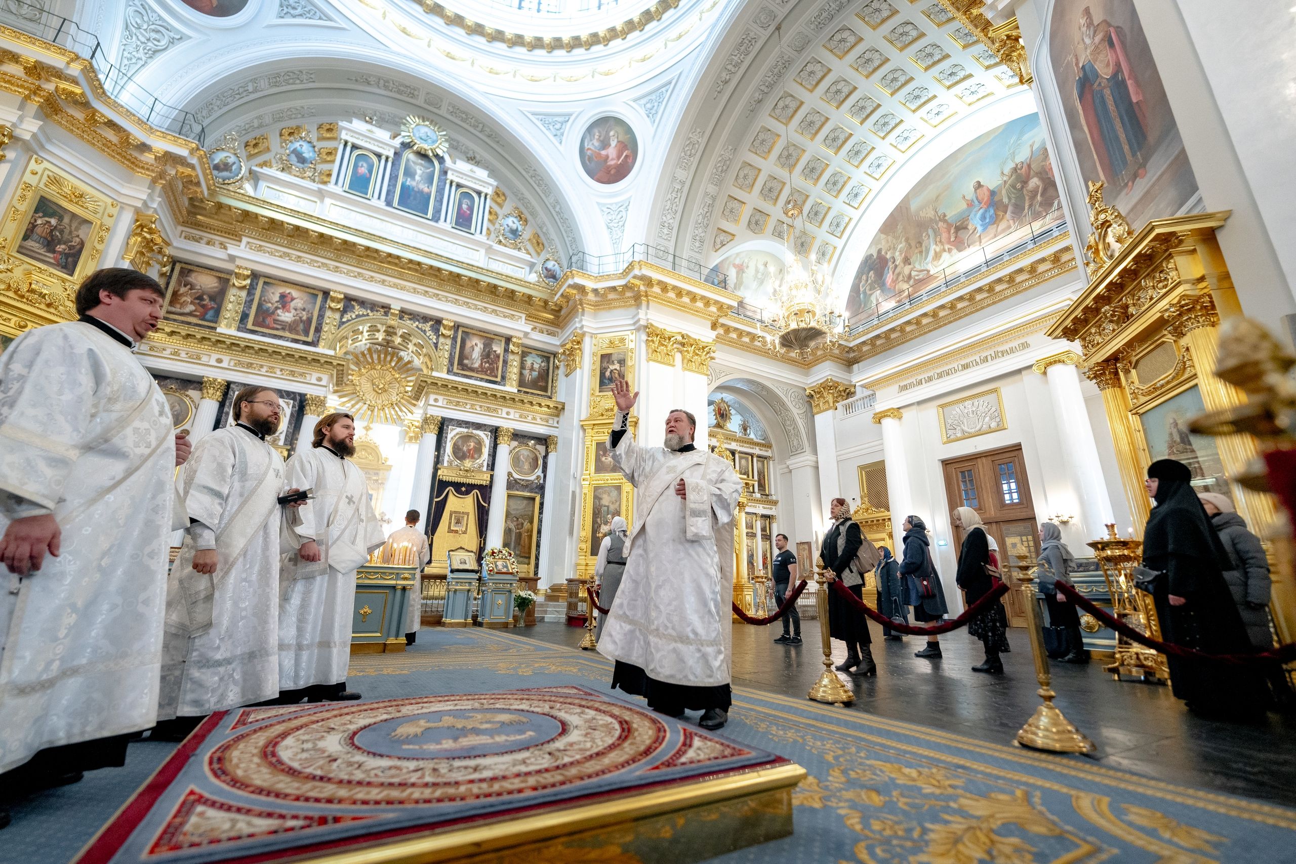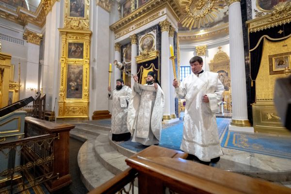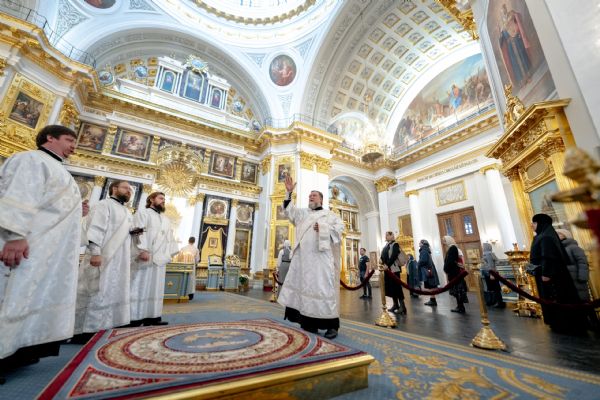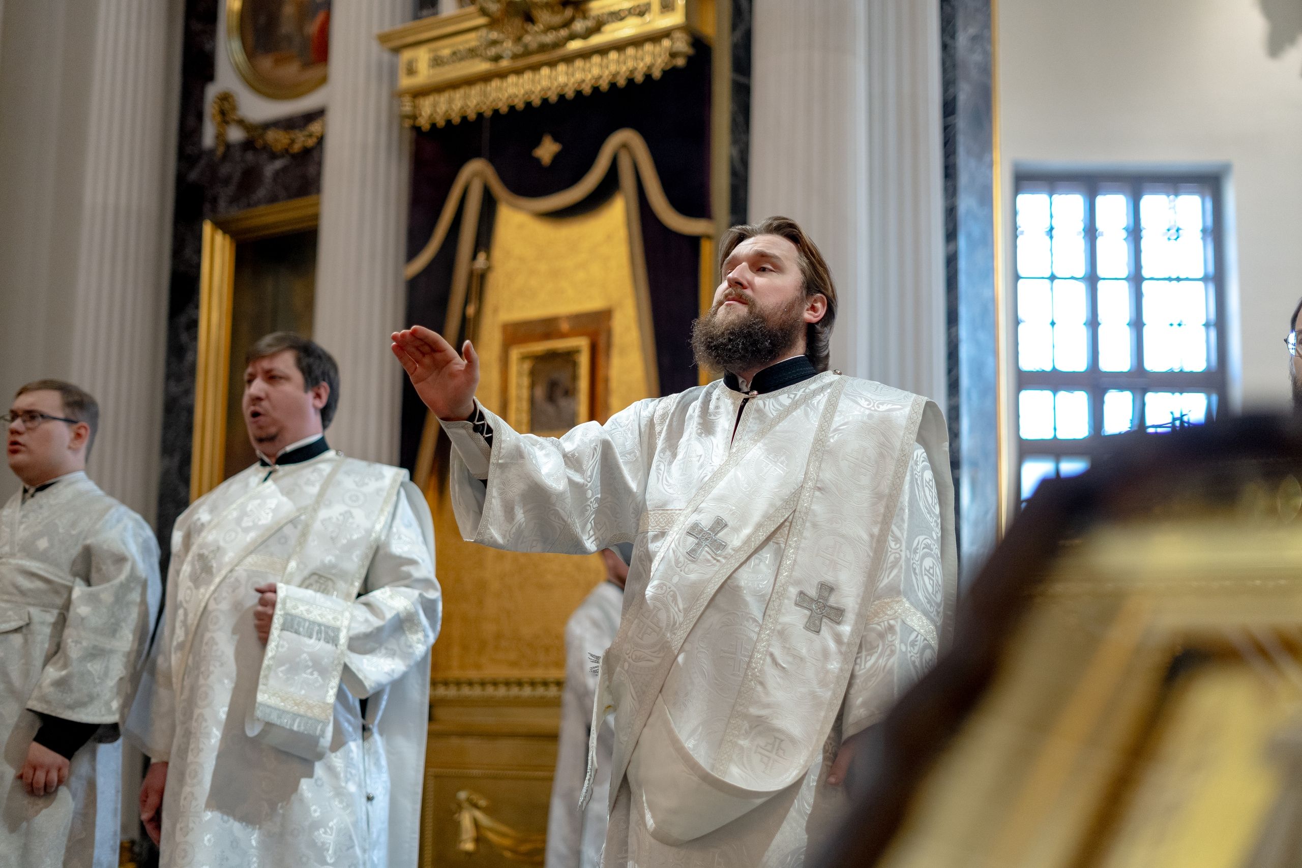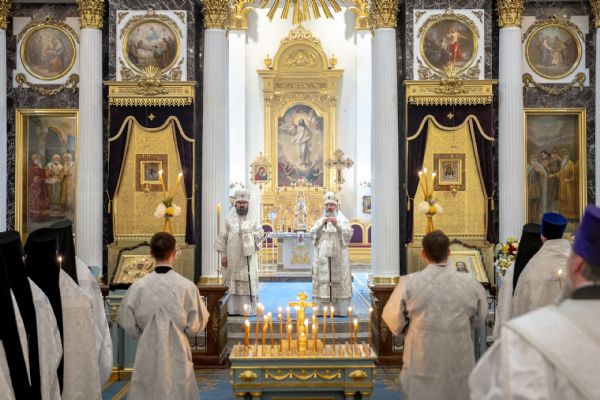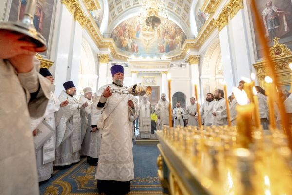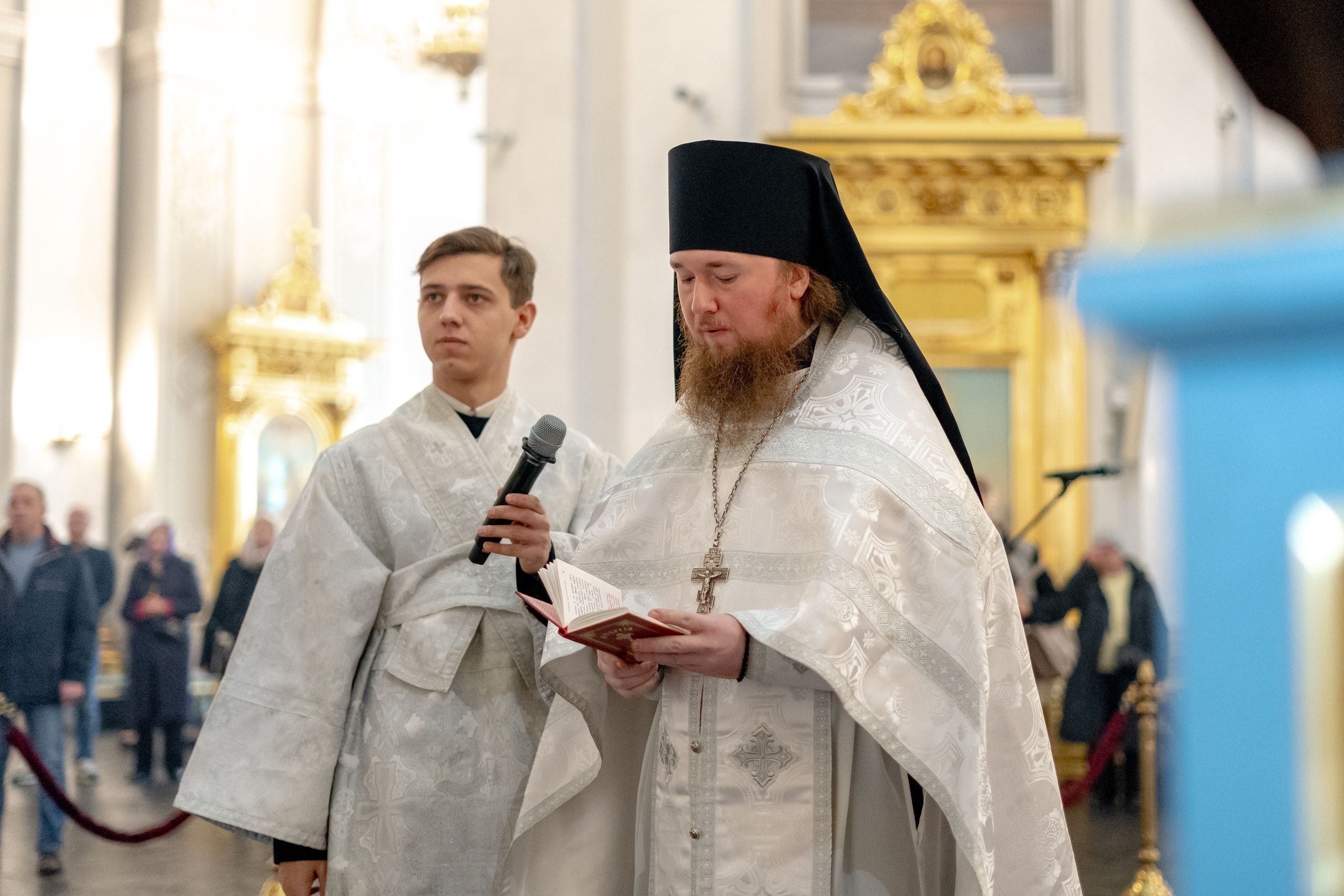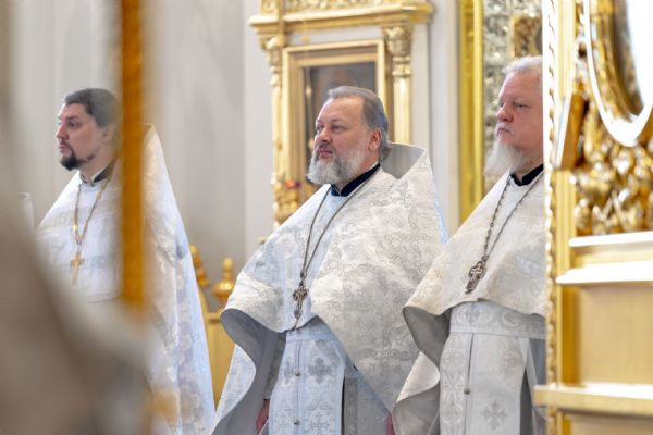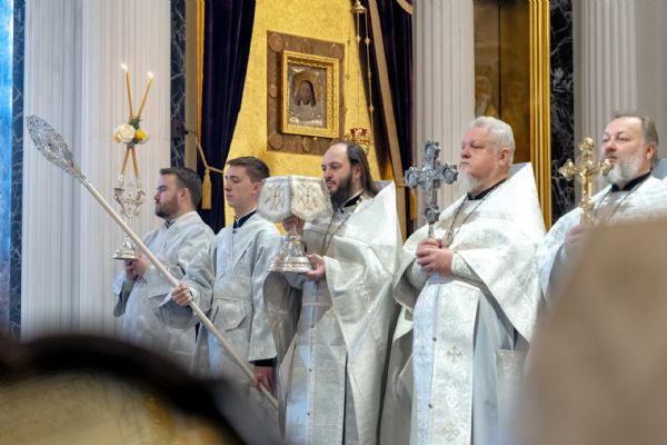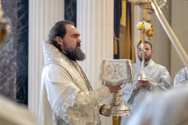 На мирной и сугубой ектениях были вознесены молитвы о Российском воинстве и о мире. В сугубую ектению были включены особые прошения о здравии Святейшего Патриарха Кирилла. Также особо молились об упокоении души митрополита Феофана (Ашуркова). По запричастном стихе проповедь произнёс игумен Пимен (Ивентьев).