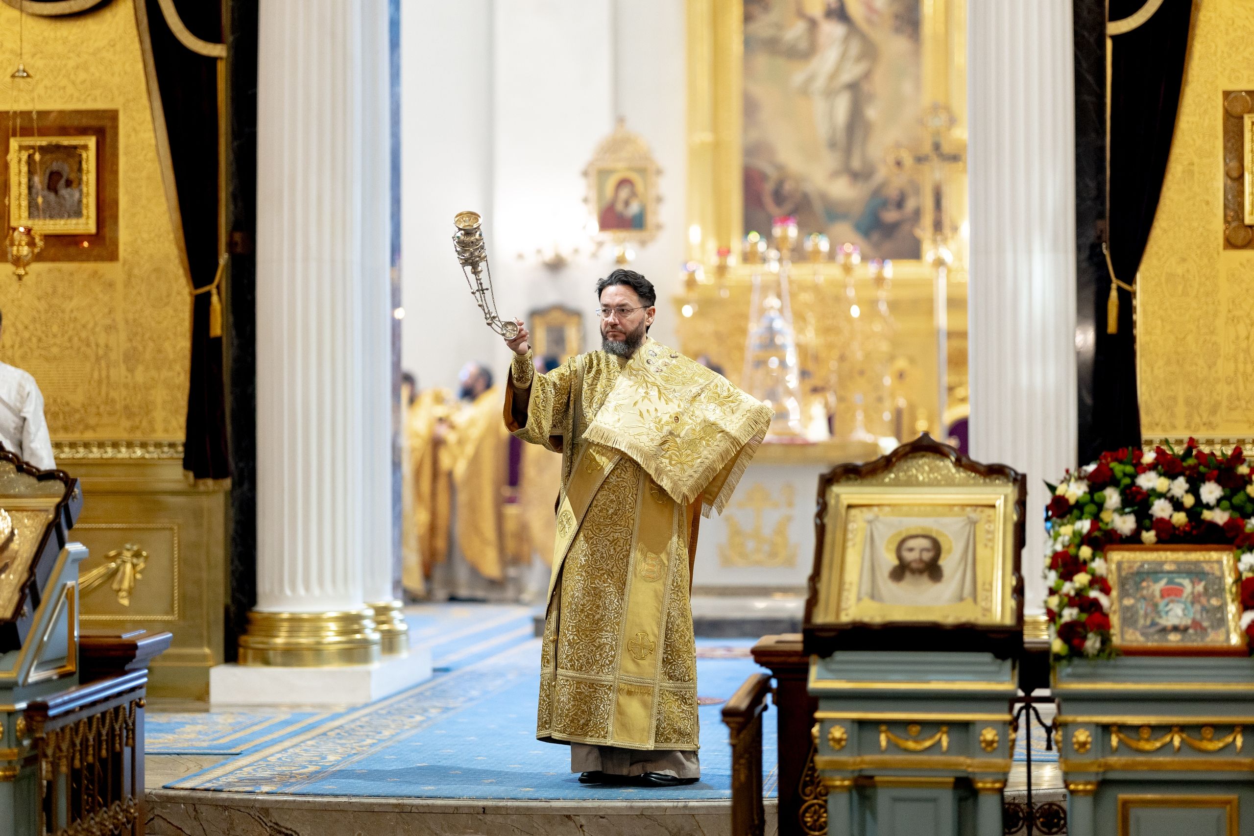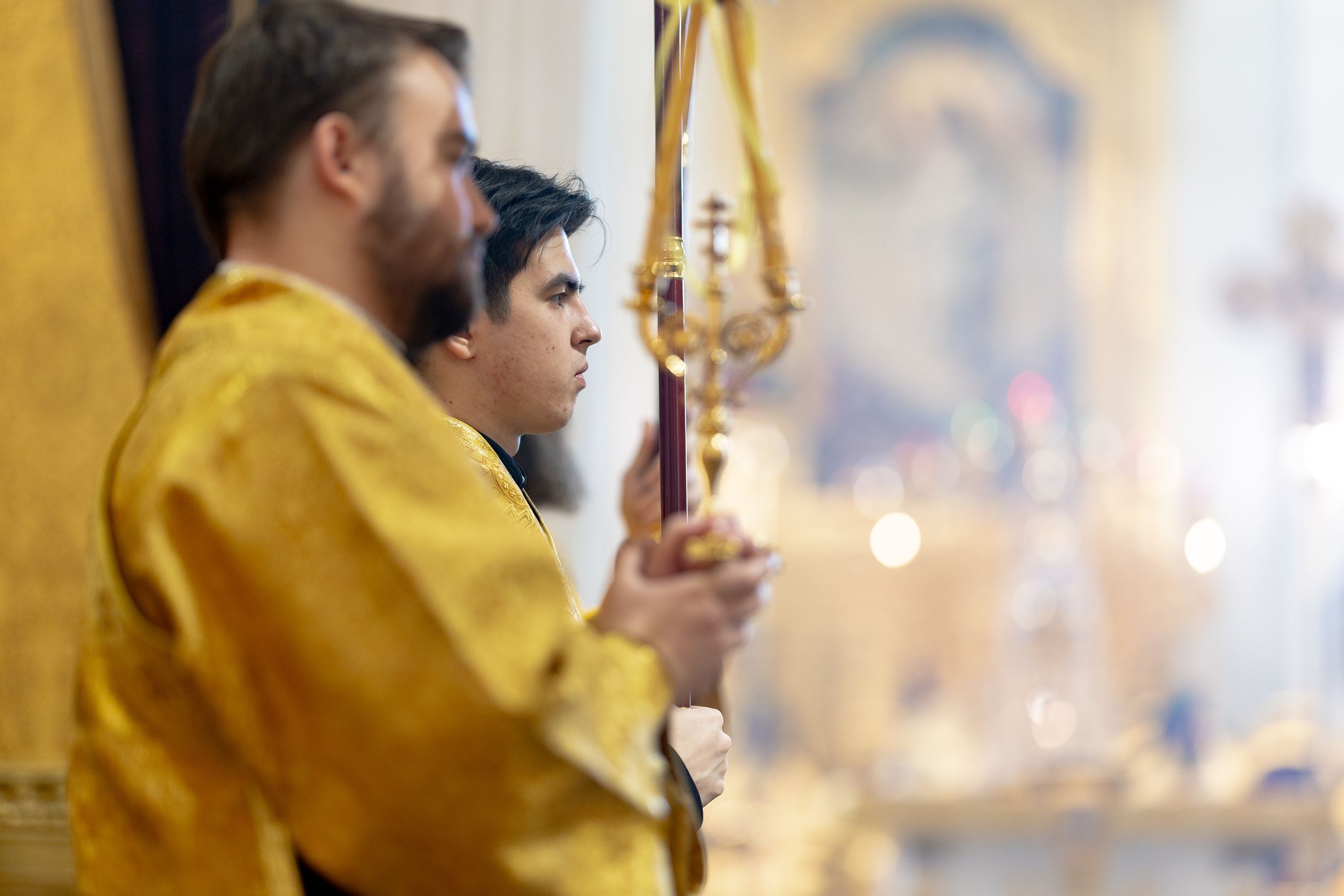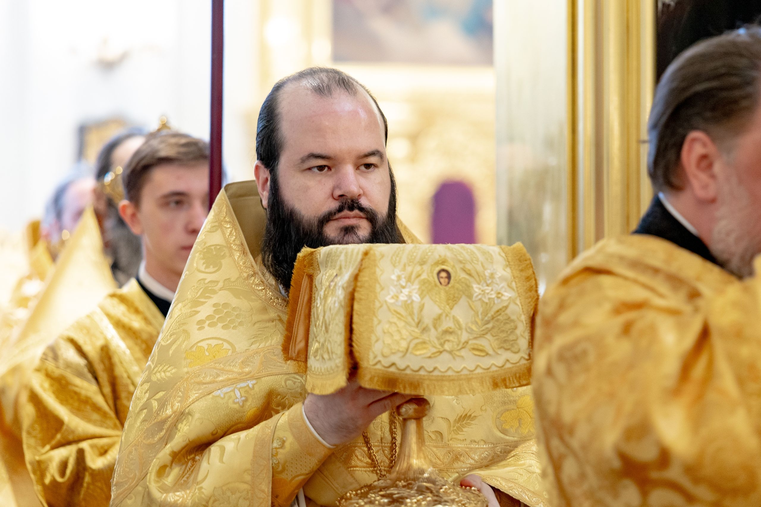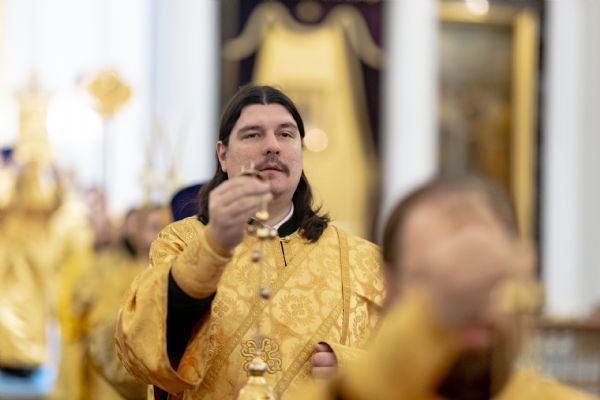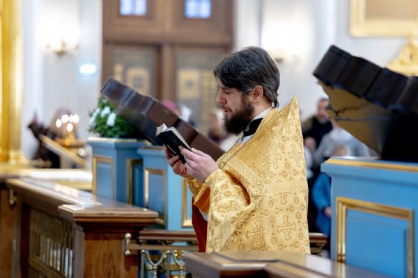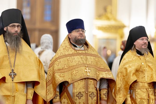 На мирной и сугубой ектениях были вознесены молитвы о Российском воинстве и о мире. Митрополит Кирилл совершил диаконскую хиротонию иподиакона Максима Никонова. По запричастном стихе проповедь произнёс иеромонах Гермоген (Рубан).