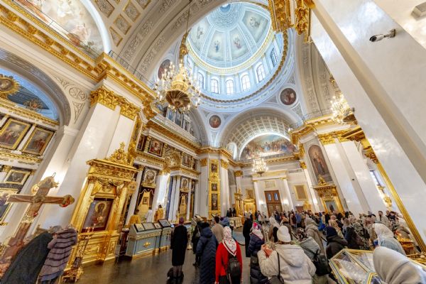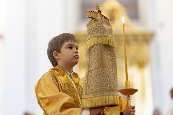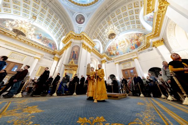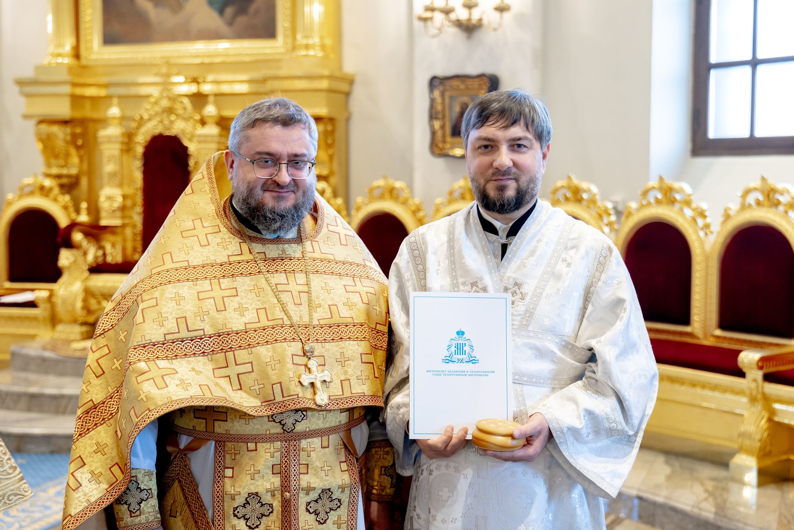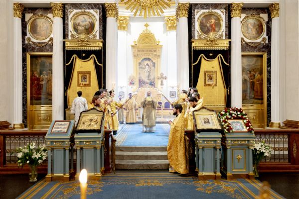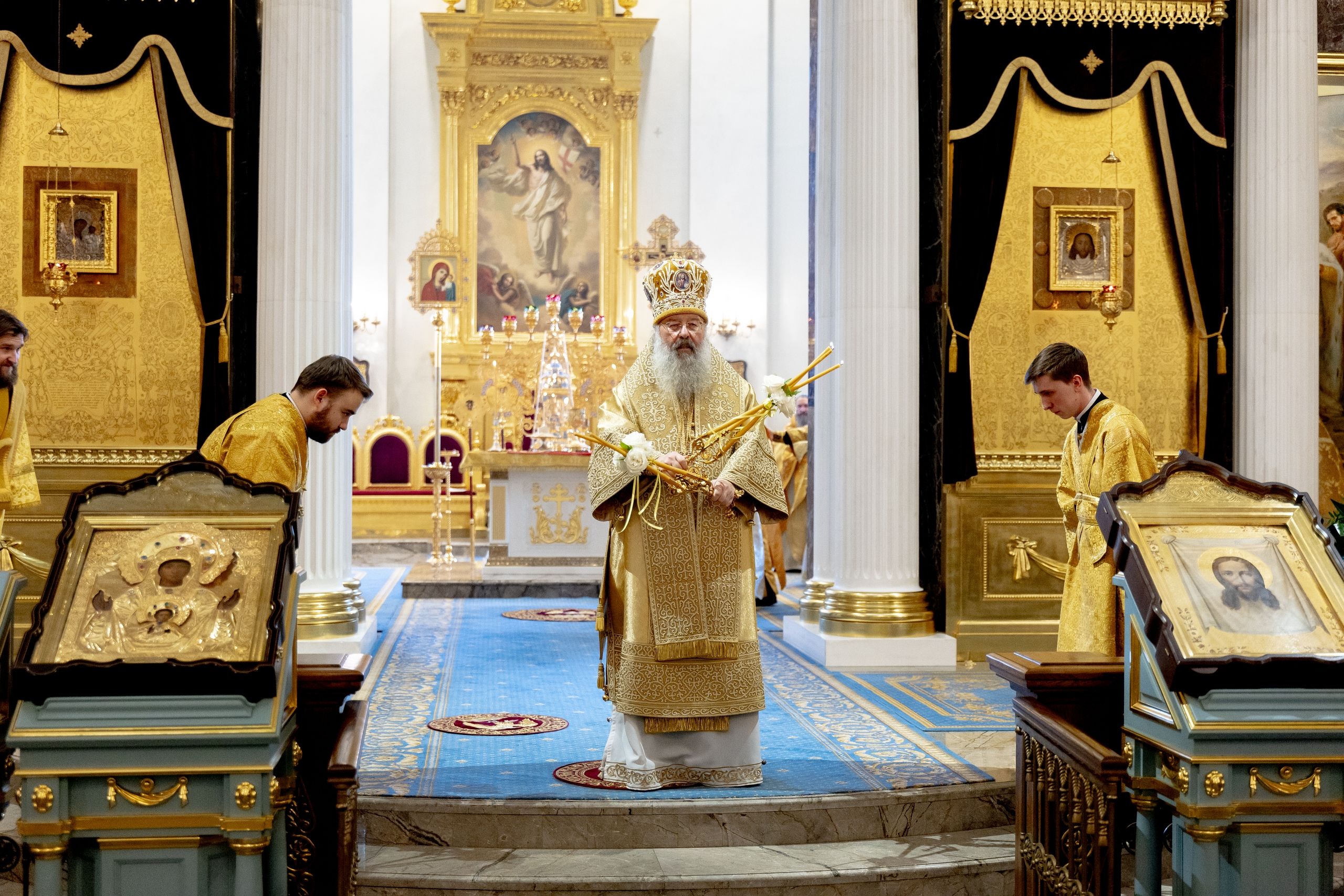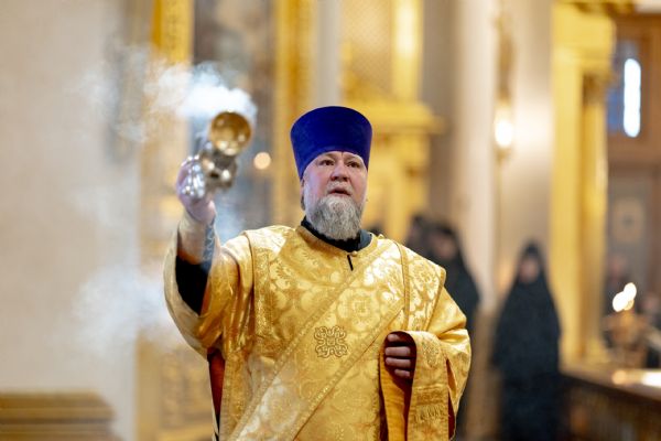 На мирной и сугубой ектениях были вознесены молитвы о Российском воинстве и о мире. Митрополит Кирилл совершил диаконскую хиротонию иподиакона Максима Никонова. По запричастном стихе проповедь произнёс иеромонах Гермоген (Рубан).