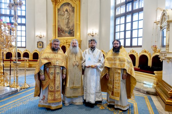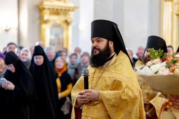 От имени духовенства и прихожан Богородицкого монастыря игумен Марк (Виленский) поздравил главу Татарстанской митрополии с пятилетием прибытия на Казанскую кафедру: