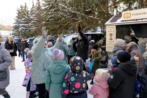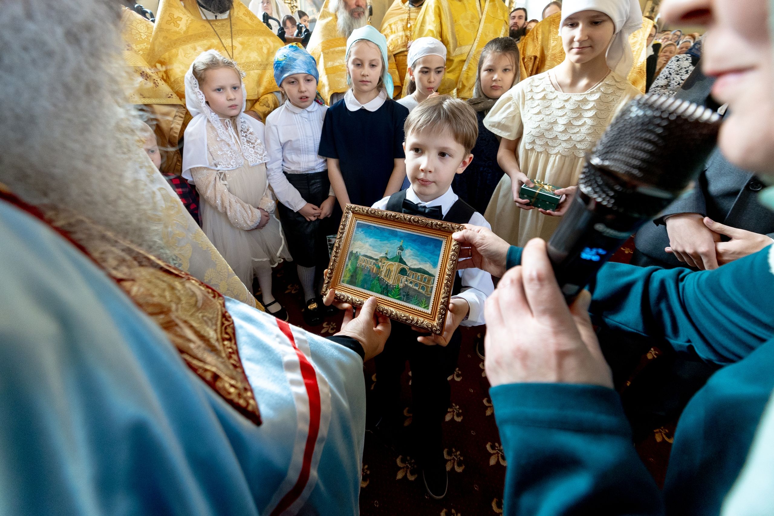 Руководитель воскресной школы храма праведного Иоанна Кронштадтского Инна Валеева поблагодарила митрополита Кирилла за радость совместной молитвы и преподнесла подарки ручной работы, которые изготовили воспитанники. Дети подарили архипастырю рождественскую пряничную композицию и композицию из пластилина. Архиерею также вручили электронный носитель с записью пластилиновых мультфильмов, посвящённых Рождеству Христову и святителю Тихону Московского. Над созданием мультфильмов трудились студенты Казанской семинарии и учащиеся воскресной школы.