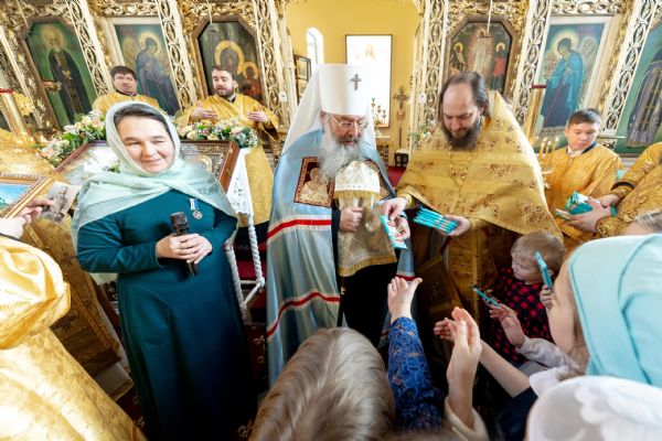 Владыка поблагодарил ребят за труды и вручил им сладкие подарки. Прихожанам храма на молитвенную память были вручены портреты праведного Иоанна Кронштадтского.