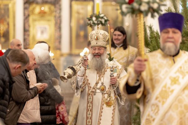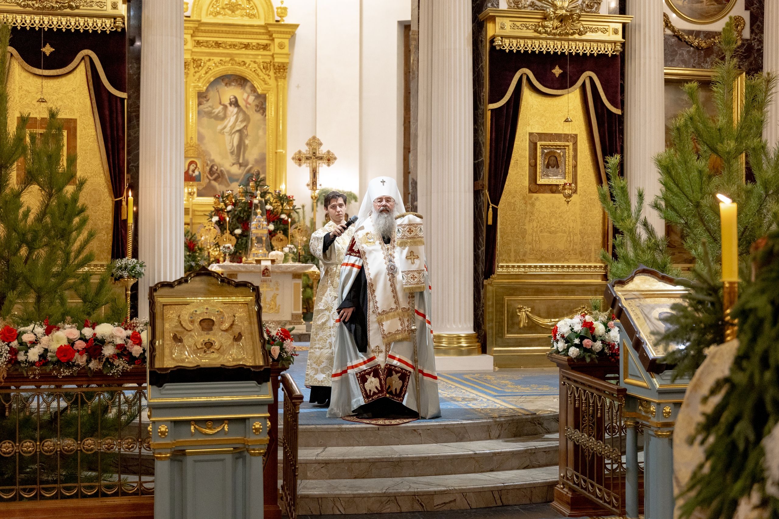 В завершение было совершено славление Рождеству Христову. Митрополит Кирилл поздравил духовенство и мирян с праздником.