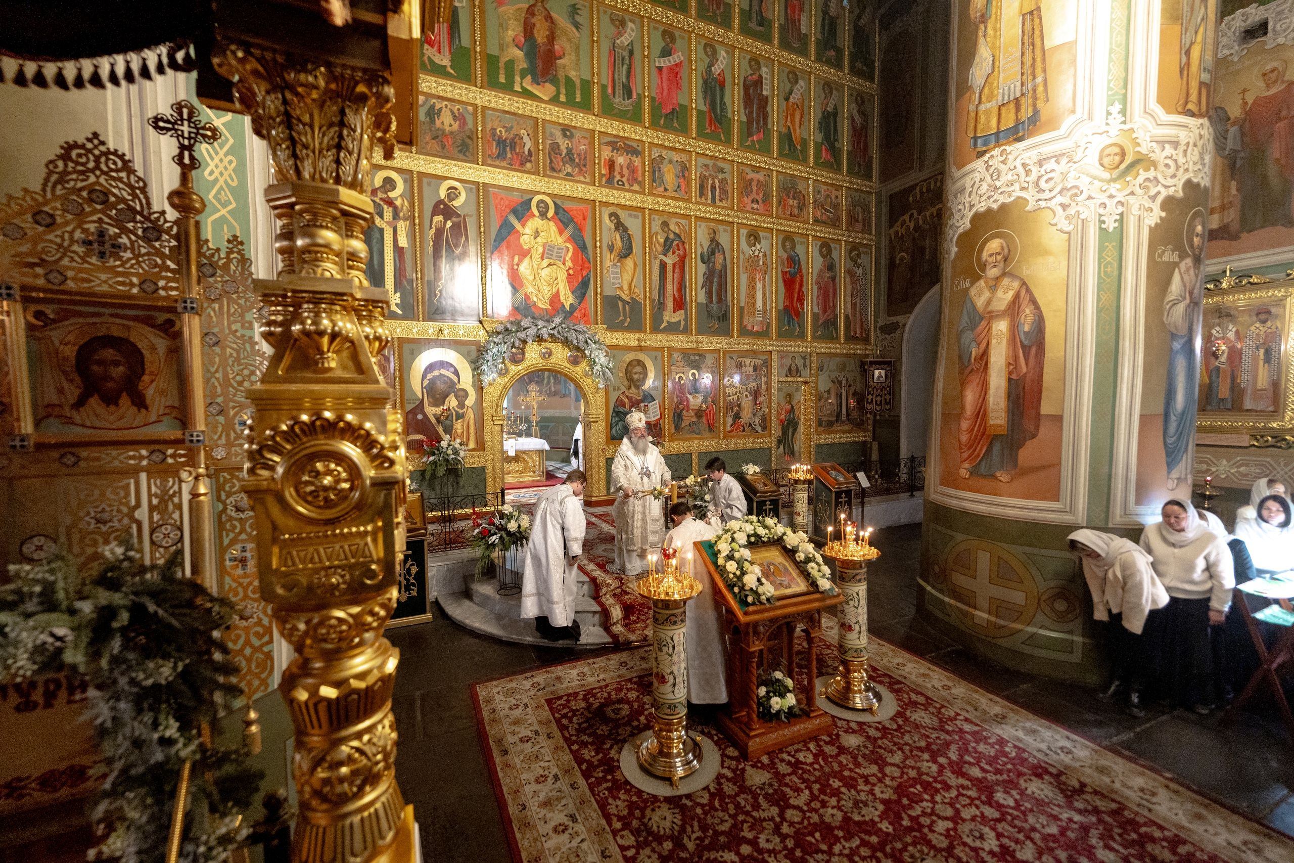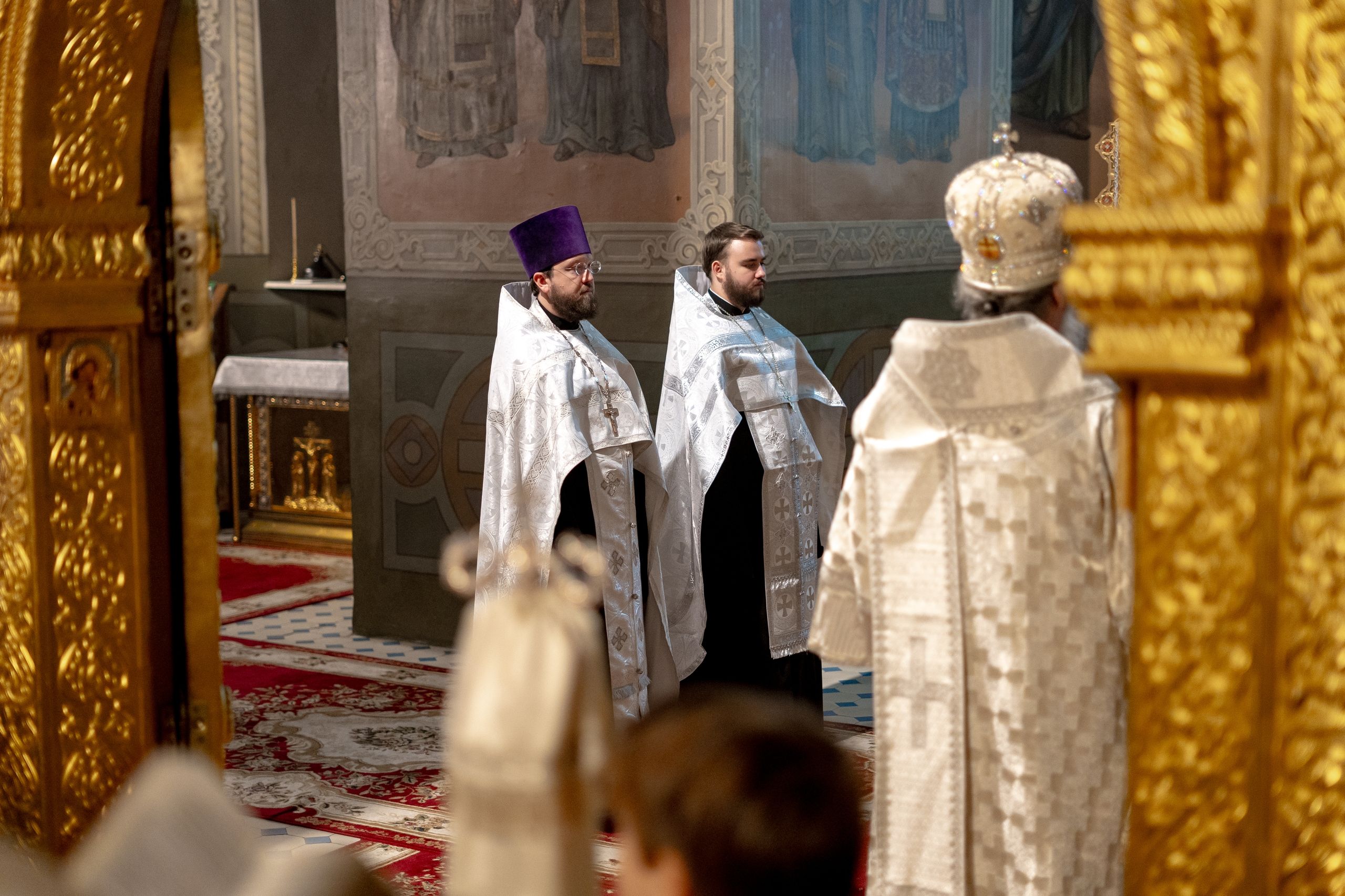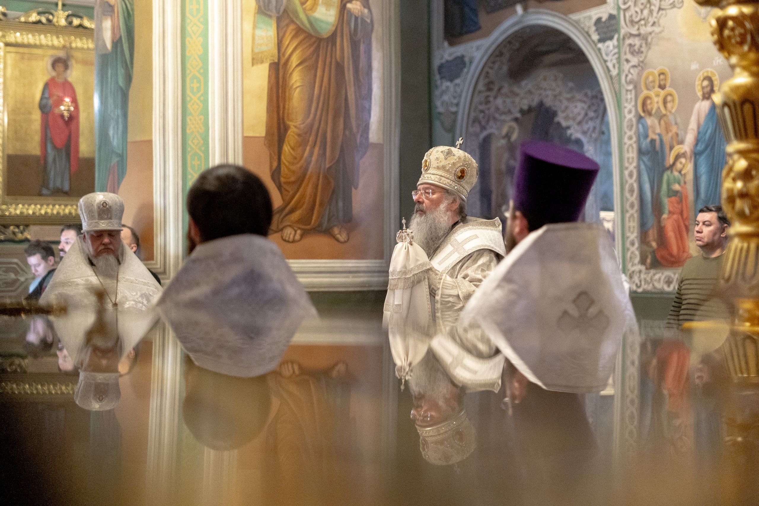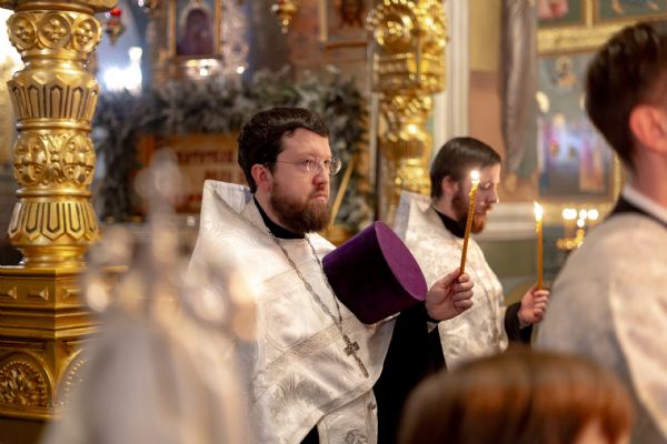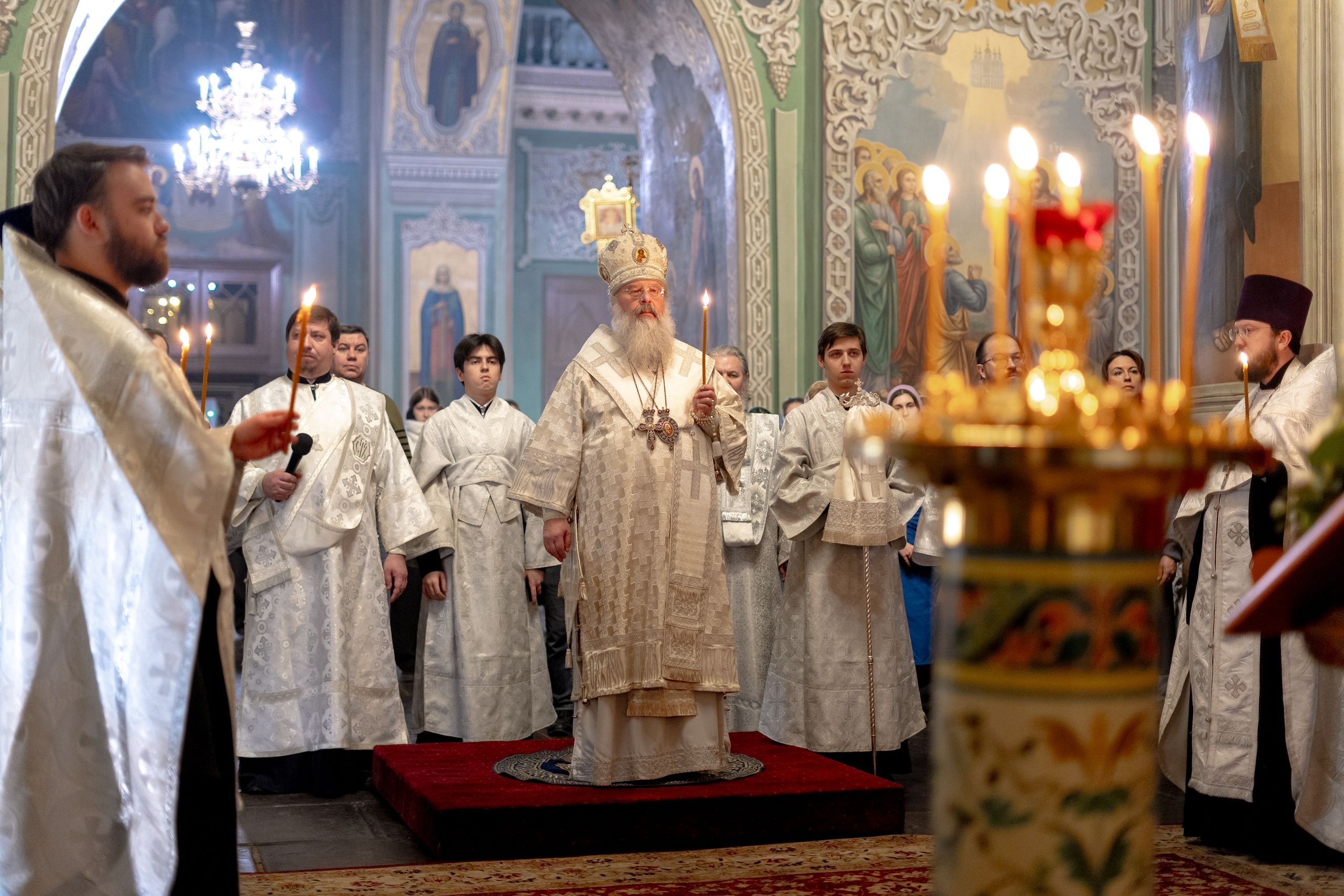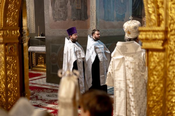 Его Высокопреосвященству сослужили благочинный I Казанского округа протоиерей Владимир Самойленко, ключарь Благовещенского собора иерей Виктор Бельских, клирик собора иерей Александр Махов, клирики храма преподобного Серафима Саровского города Казани иерей Никита Ярош и иерей Роман Ермолаев.