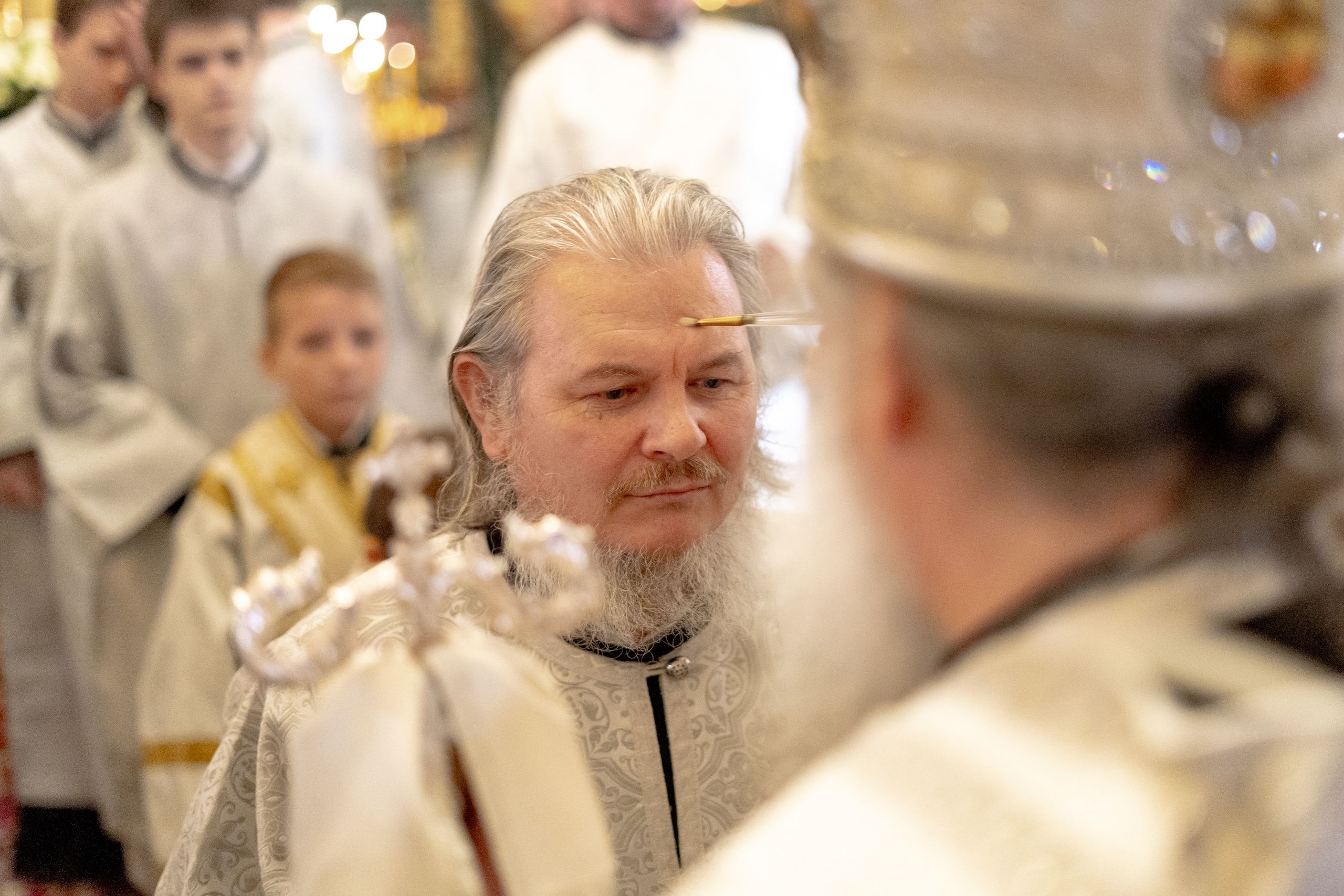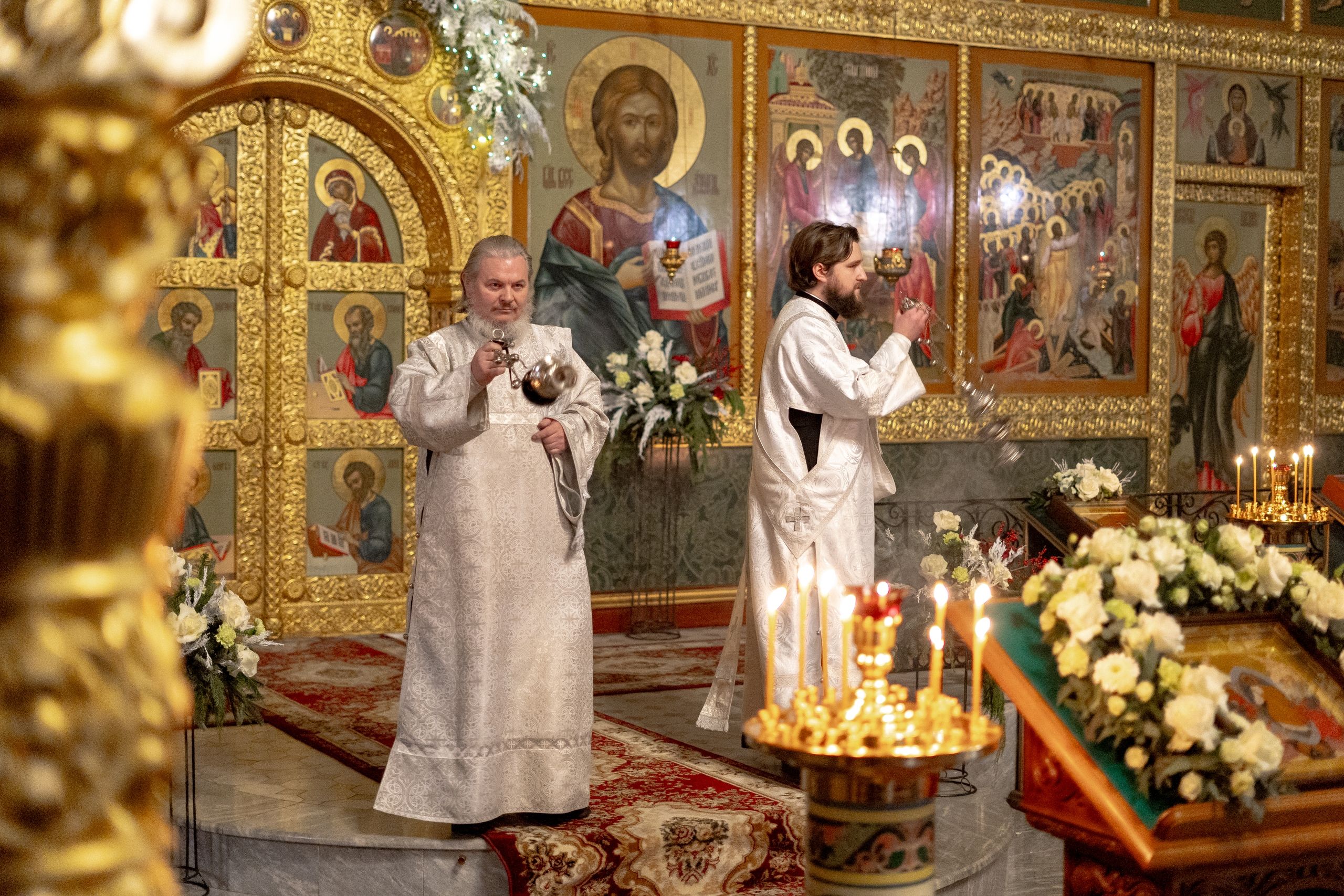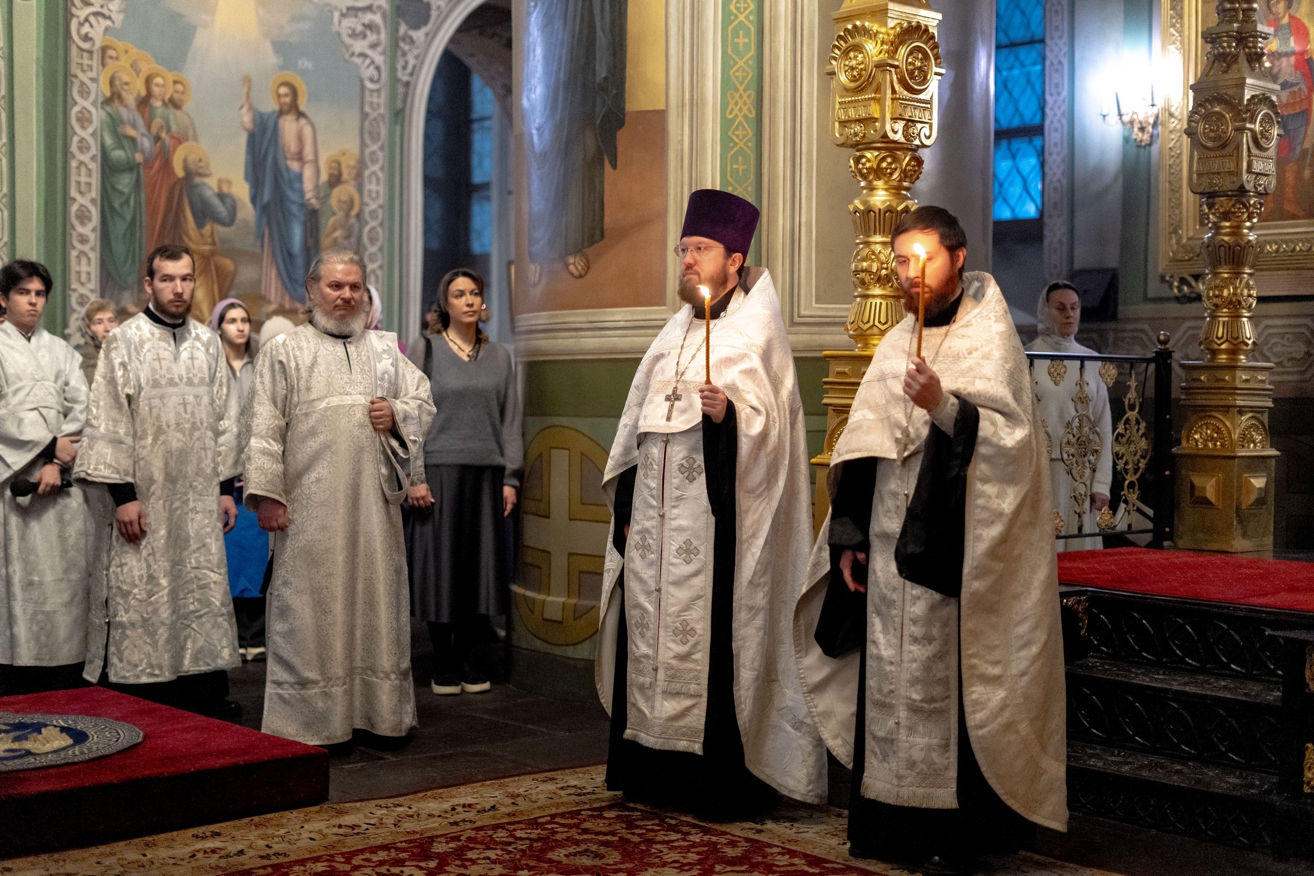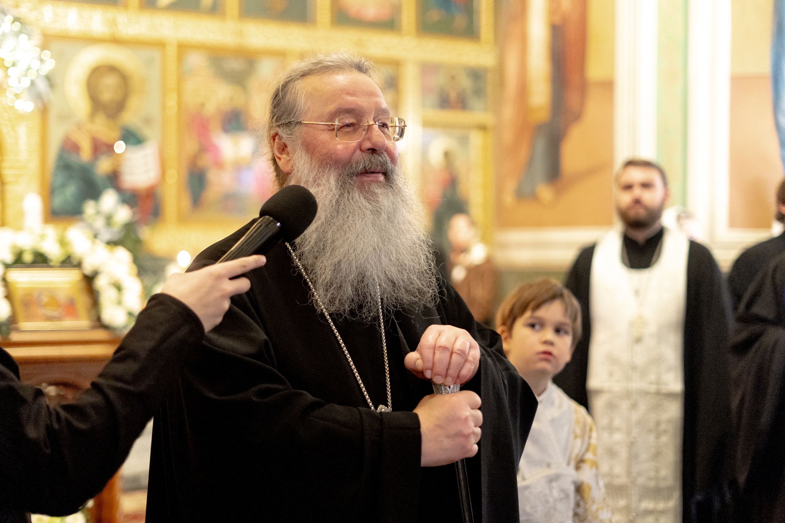 Его Высокопреосвященству сослужили благочинный I Казанского округа протоиерей Владимир Самойленко, ключарь Благовещенского собора иерей Виктор Бельских, клирик собора иерей Александр Махов, клирики храма преподобного Серафима Саровского города Казани иерей Никита Ярош и иерей Роман Ермолаев.