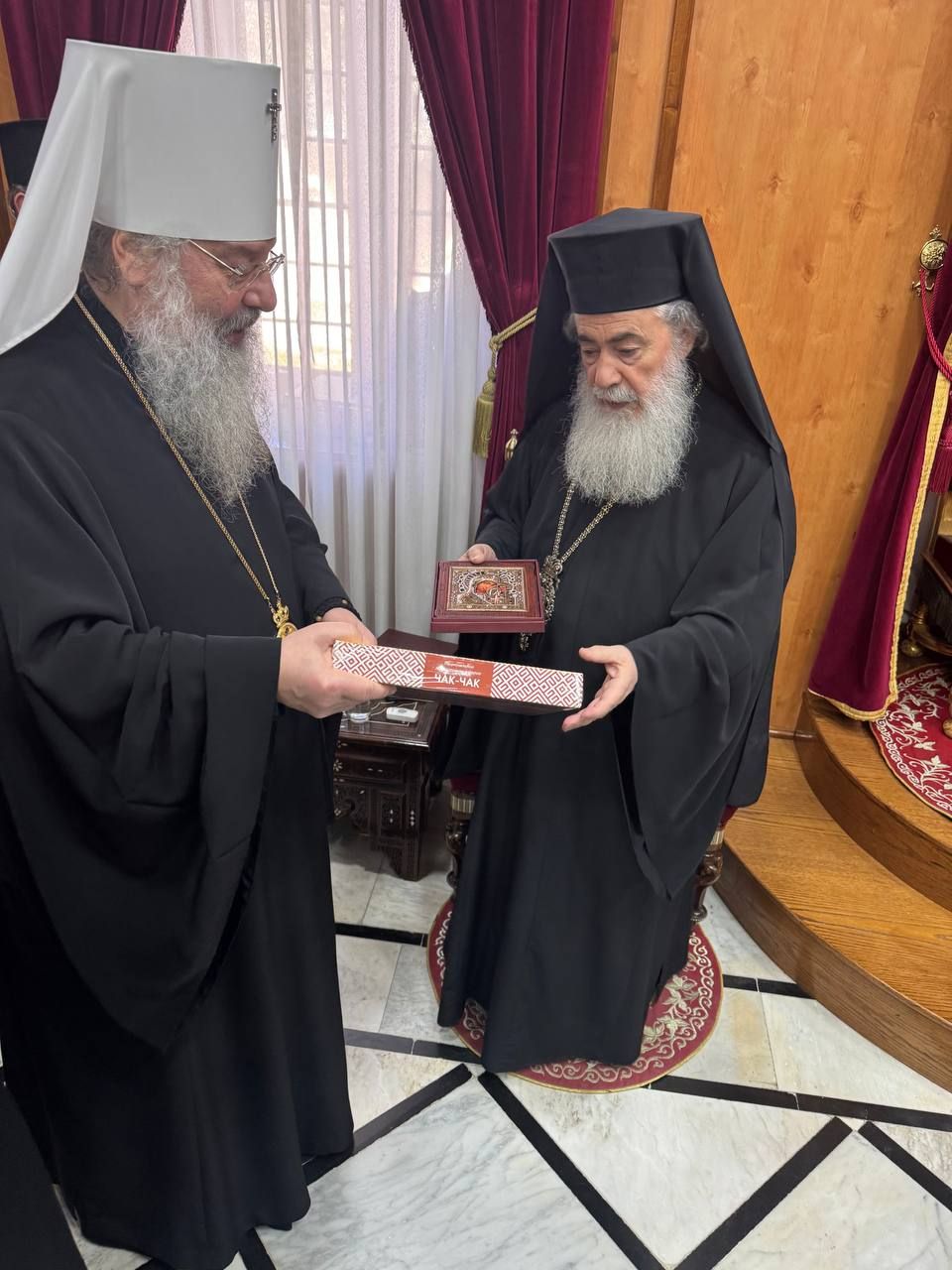 Митрополит Кирилл поблагодарил Предстоятеля Иерусалимской Церкви за возможность вновь побывать на Святой Земле, рассказал о жизнедеятельности Татарстанской митрополии, о динамичном развитии Республики Татарстан.