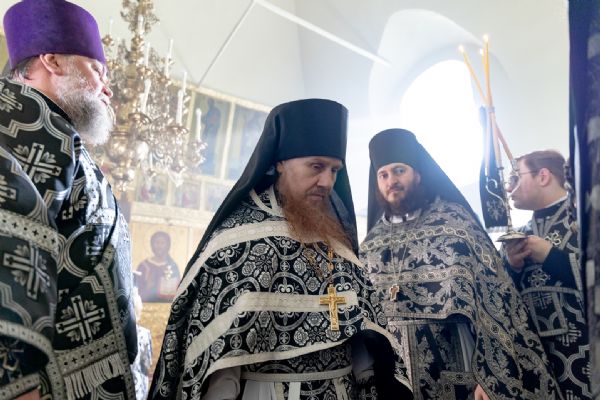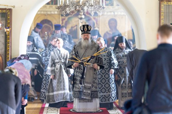 На мирной и сугубой ектениях были вознесены молитвы о Российском воинстве и о мире. На малом входе митрополит Кирилл вручил Патриаршую богослужебно-иерархическую награду: насельник Иоанно-Предтеченского монастыря иеромонах Иоанн (Илькин) был удостоен права ношения палицы. По запричастном стихе проповедь произнёс протоиерей Артемий Владимиров.