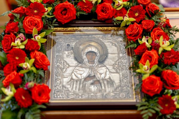 На мирной и сугубой ектениях были вознесены молитвы о Российском воинстве и о мире. Проповедь по запричастном стихе произнёс иеромонах Кирилл (Забавнов). В завершение Литургии было совершено славление преподобномученице Евдокии. Также было возглашено многолетие Святейшему Патриарху Московскому и всея Руси Кириллу, 50-летие архиерейской хиротонии которого отмечается сегодня.