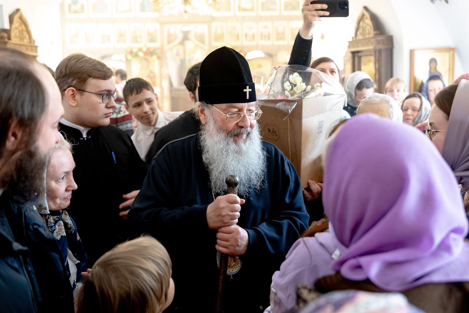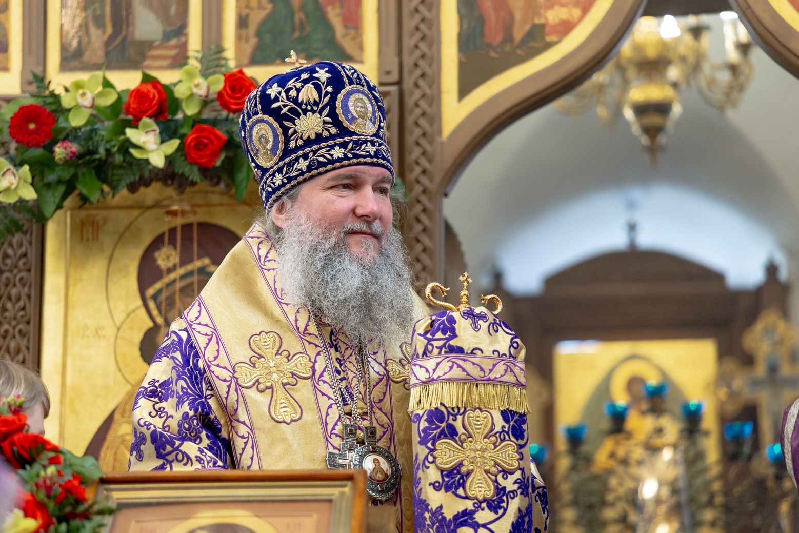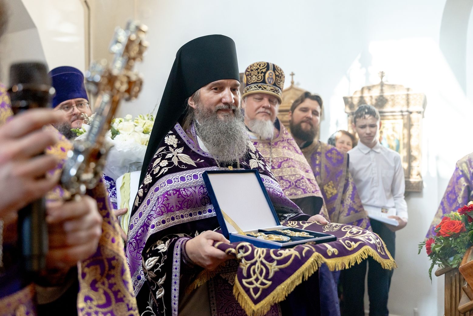Затем священник преподнёс владыке Кириллу панагию и букет цветов.