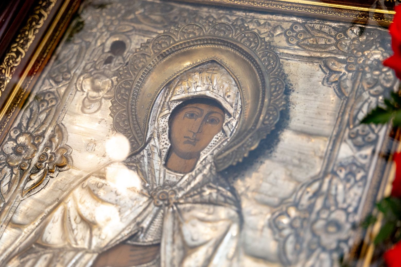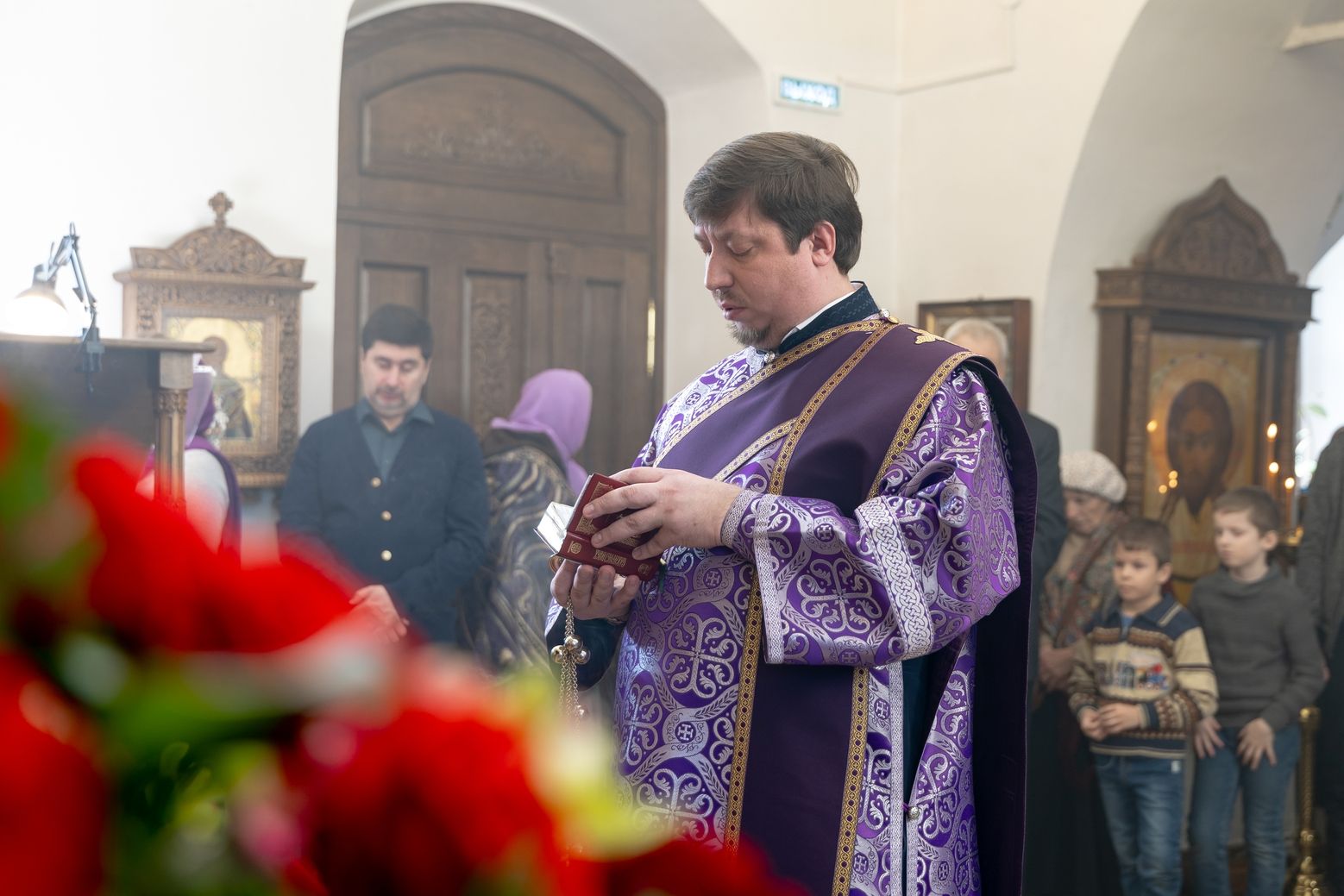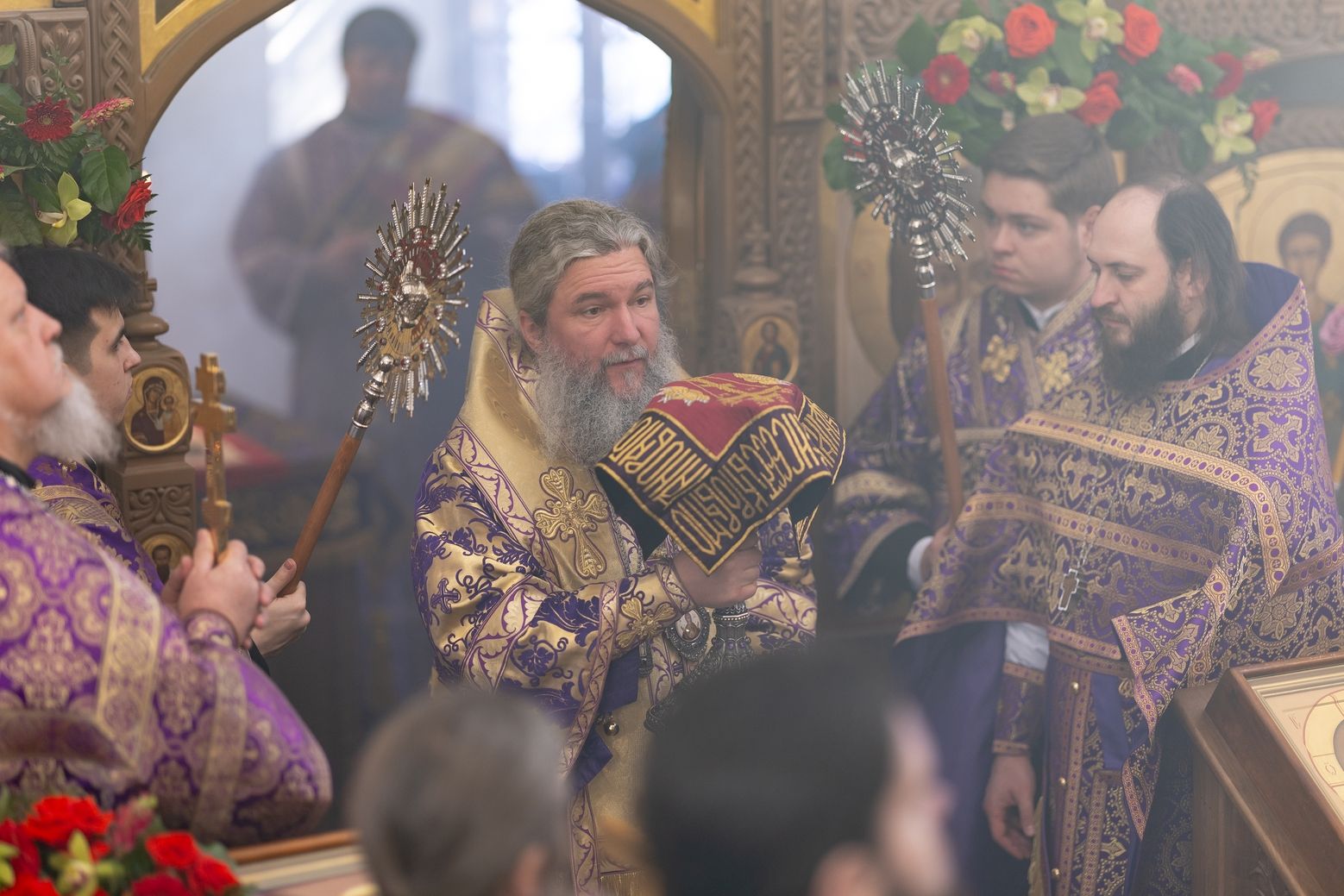 Затем священник преподнёс владыке Кириллу панагию и букет цветов.