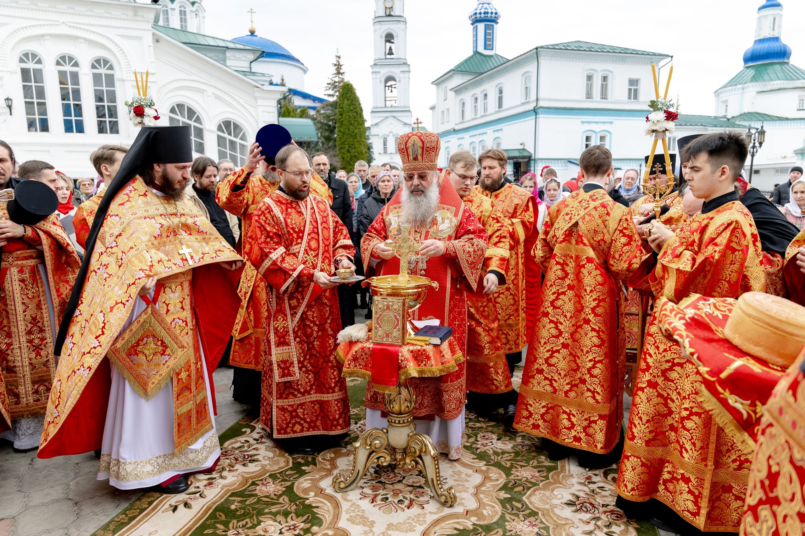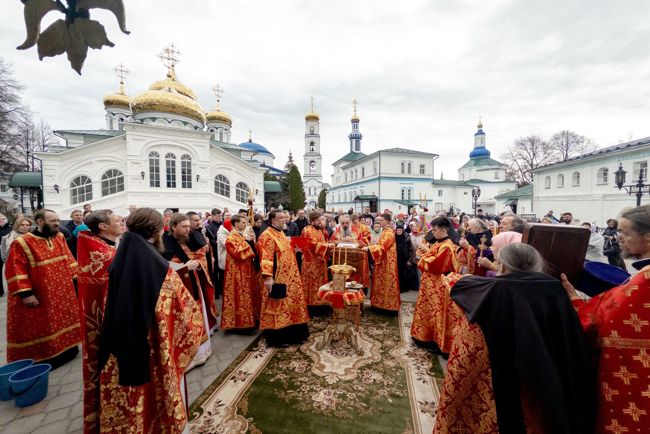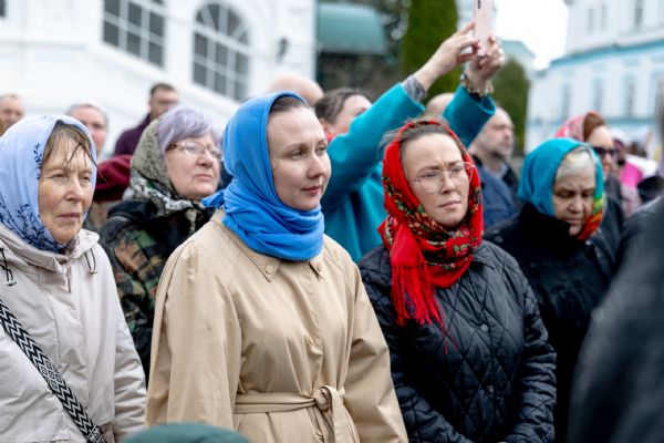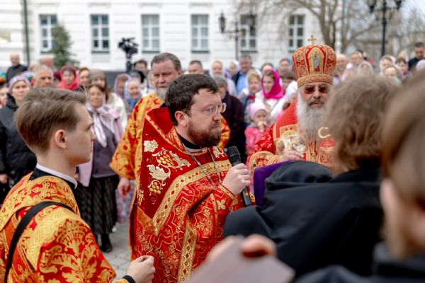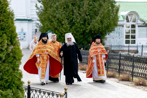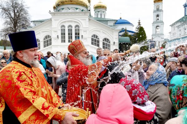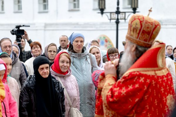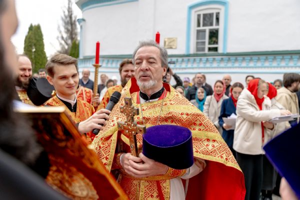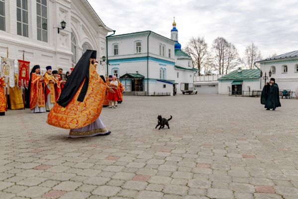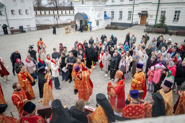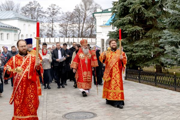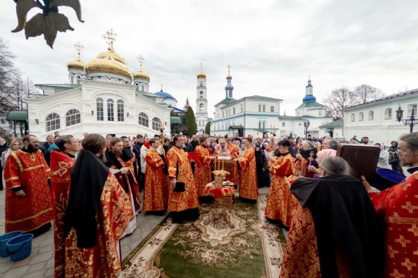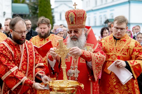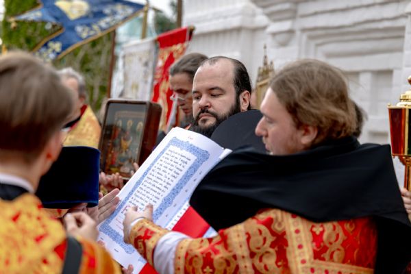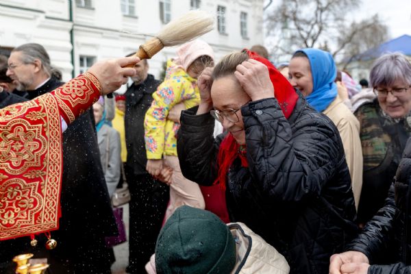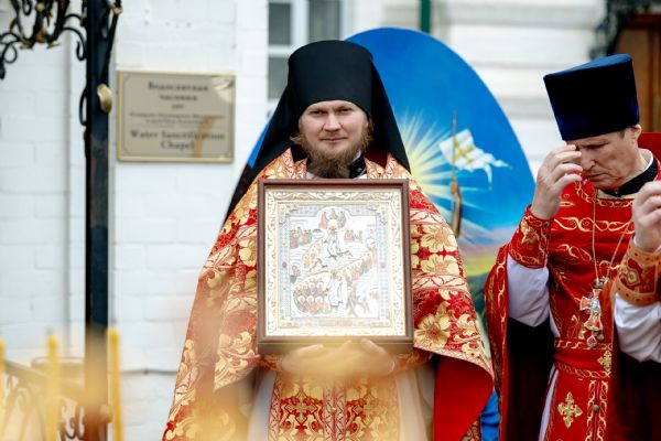 В завершение богослужения духовенство, монашествующие и миряне прошли крестным ходом к водосвятной часовне на соборной площади обители. Там было совершено малое освящение воды.
