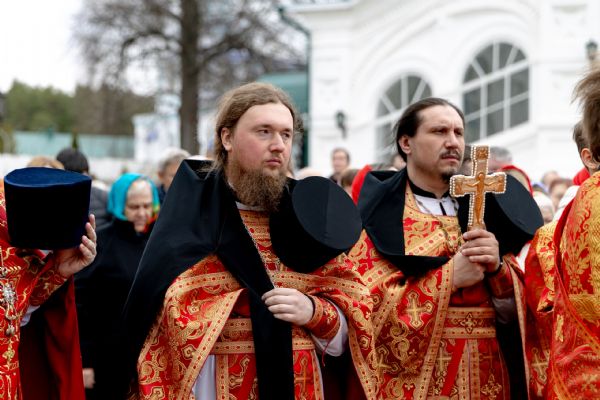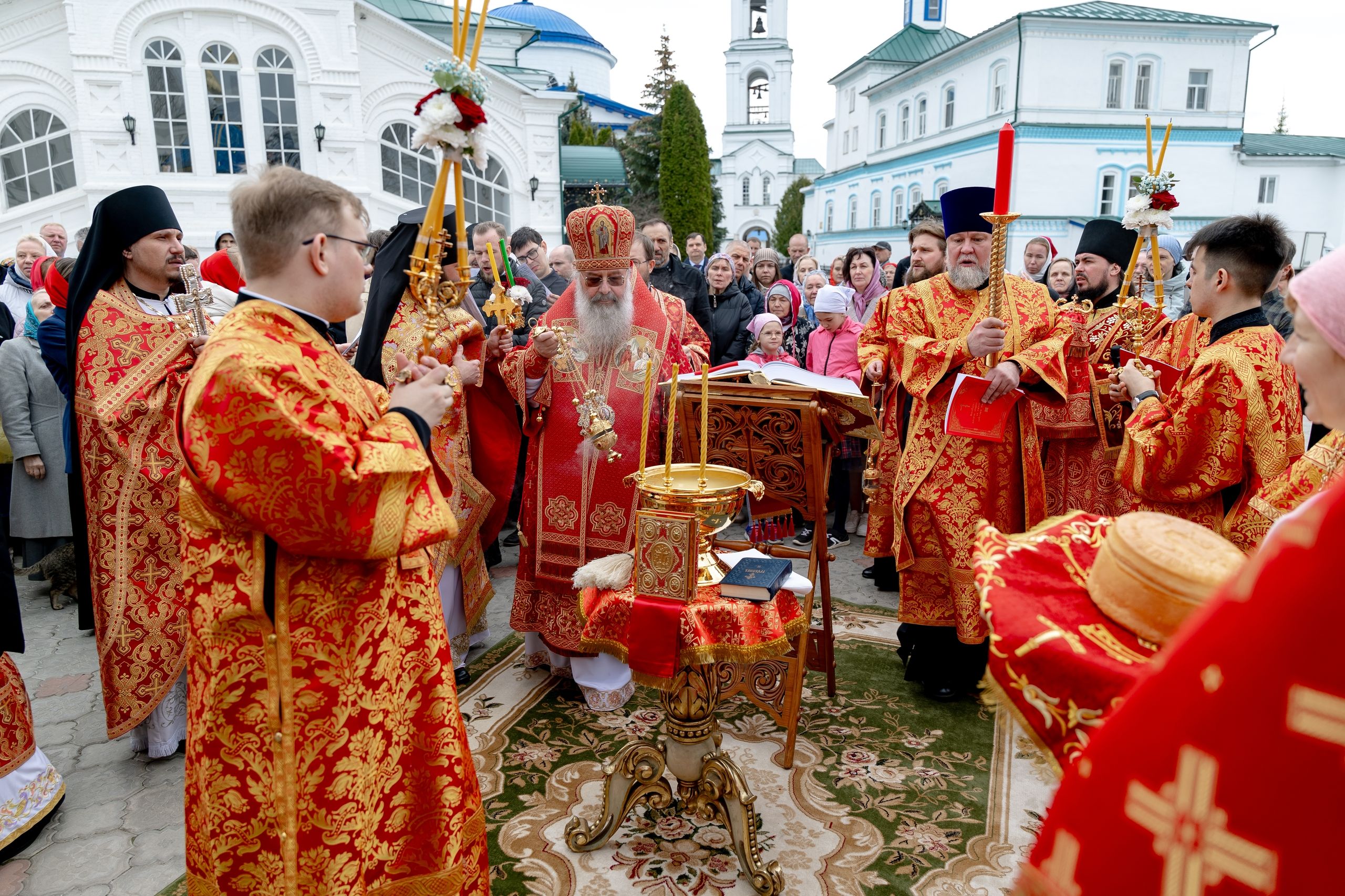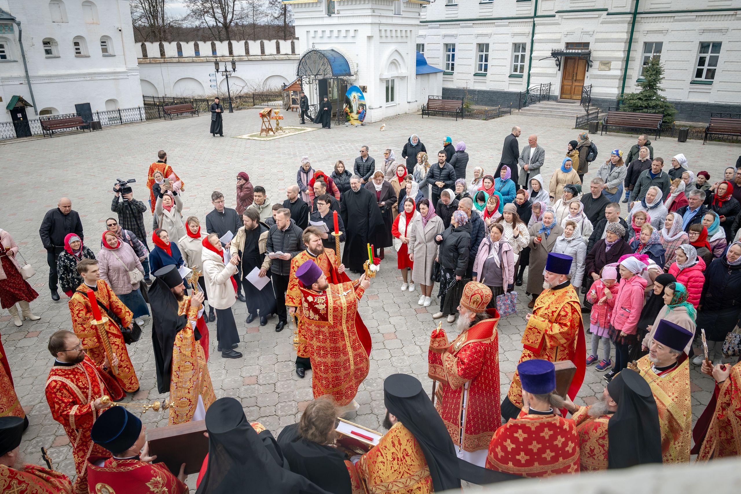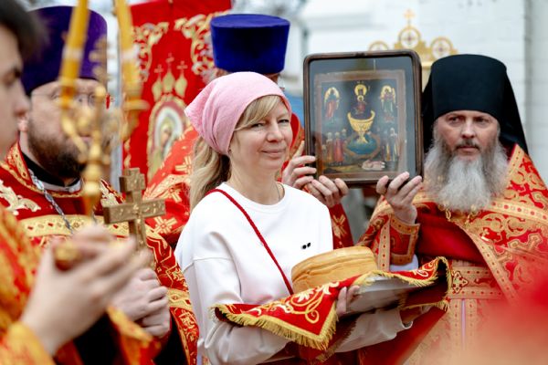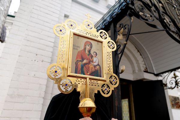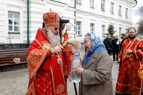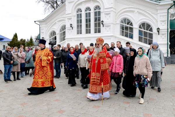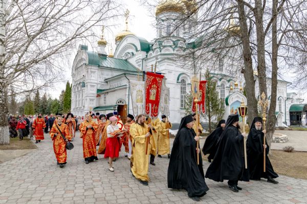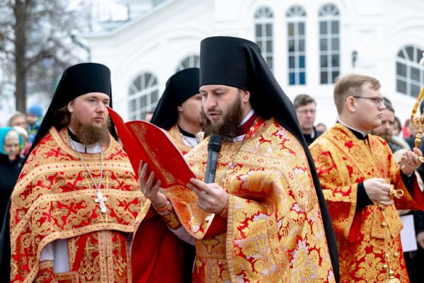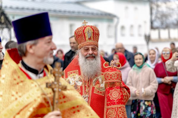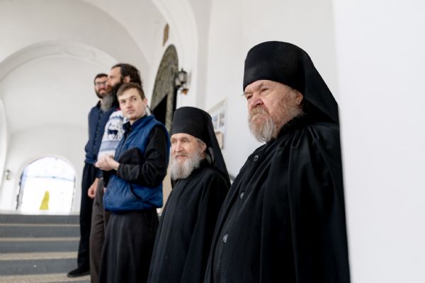 В завершение богослужения духовенство, монашествующие и миряне прошли крестным ходом к водосвятной часовне на соборной площади обители. Там было совершено малое освящение воды.
