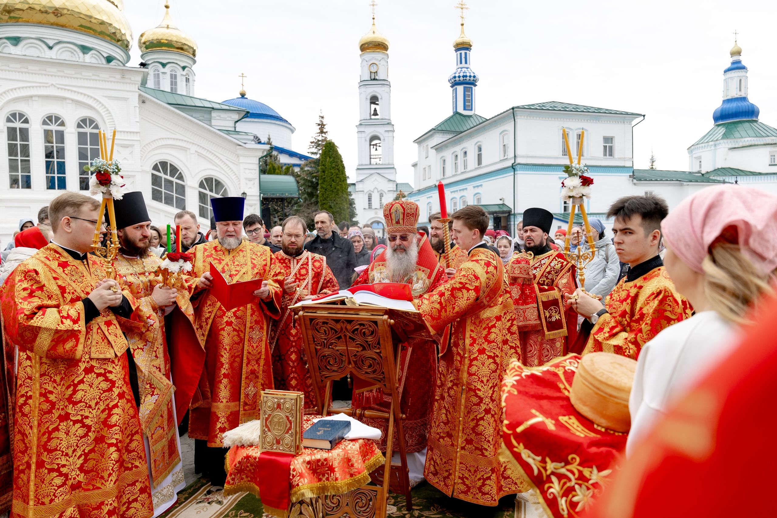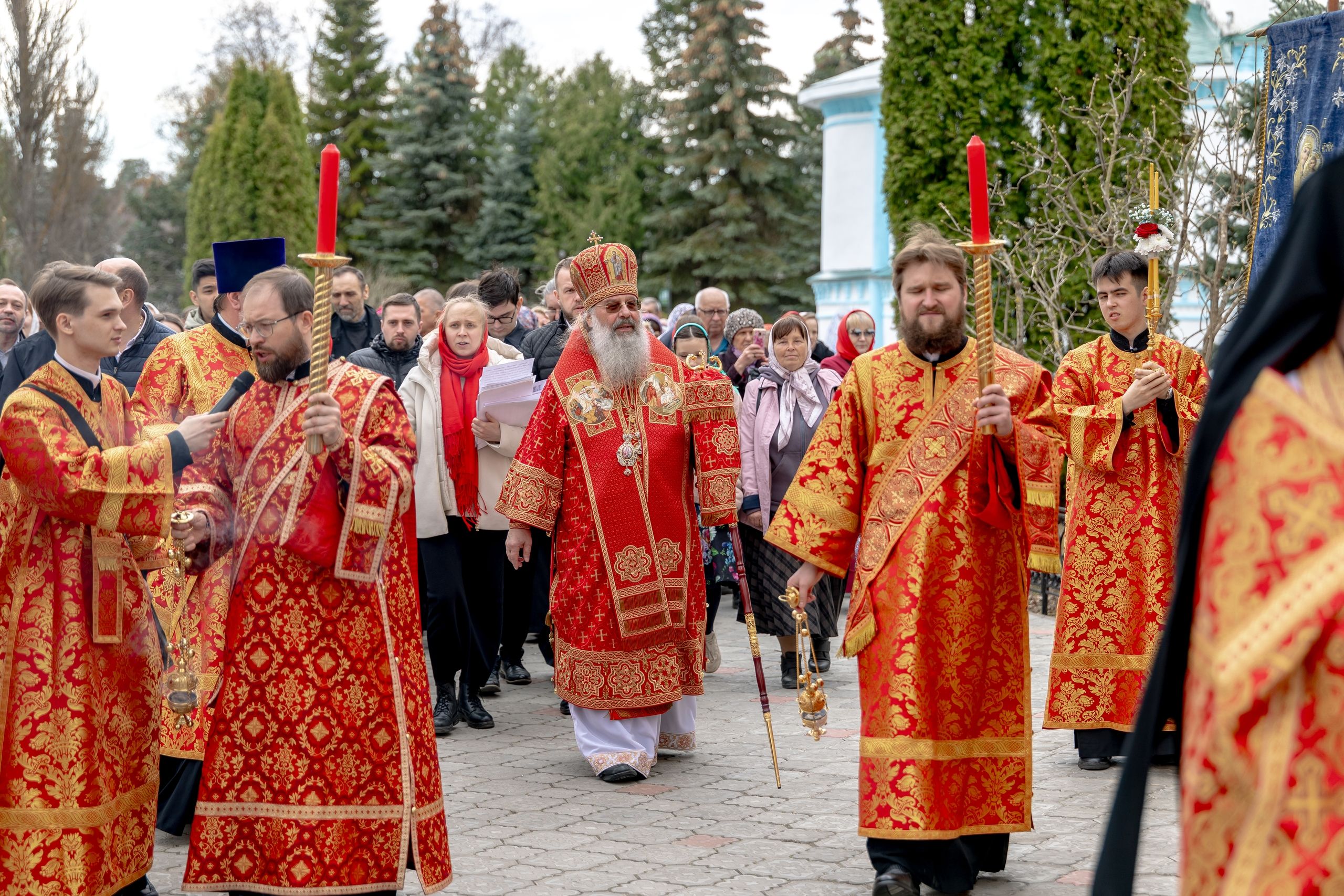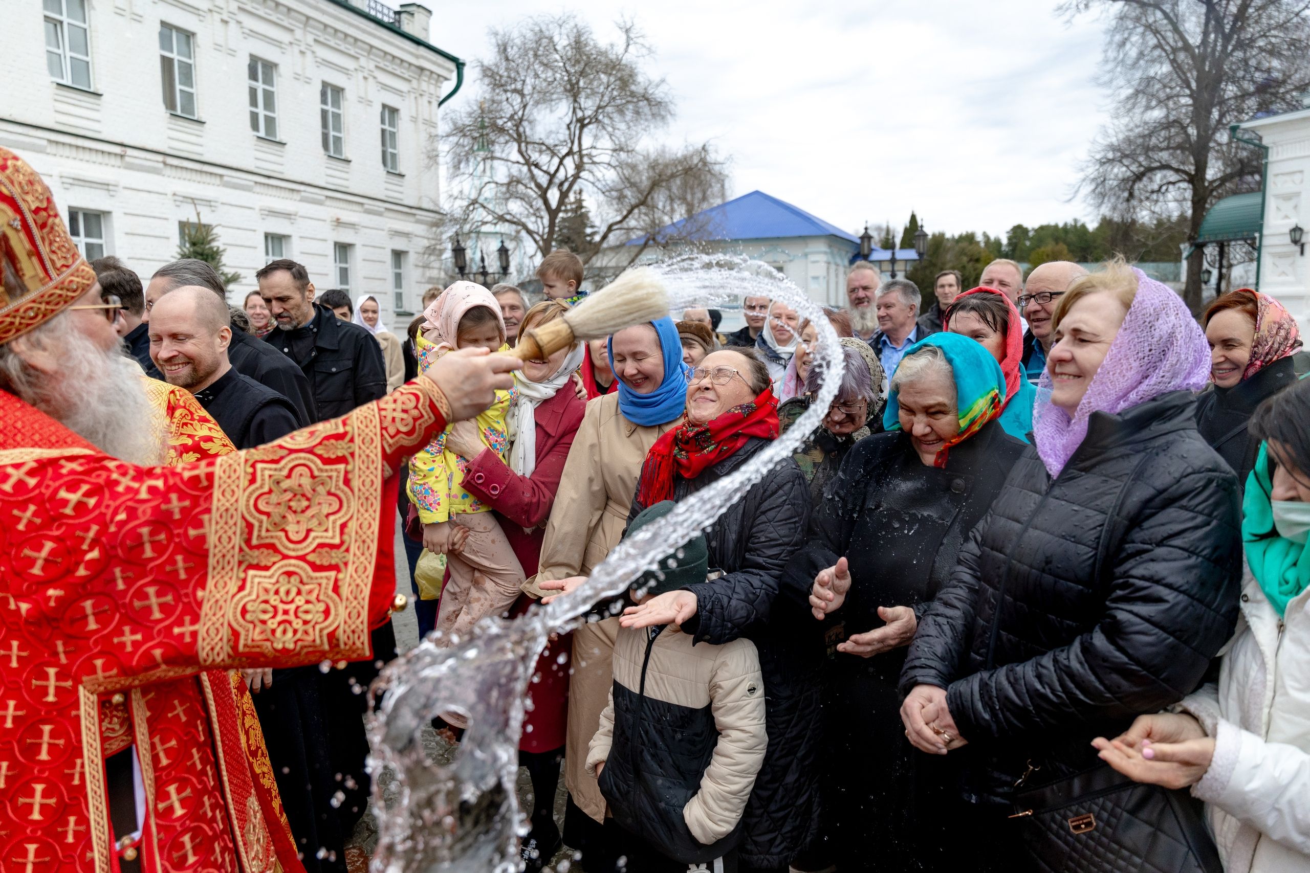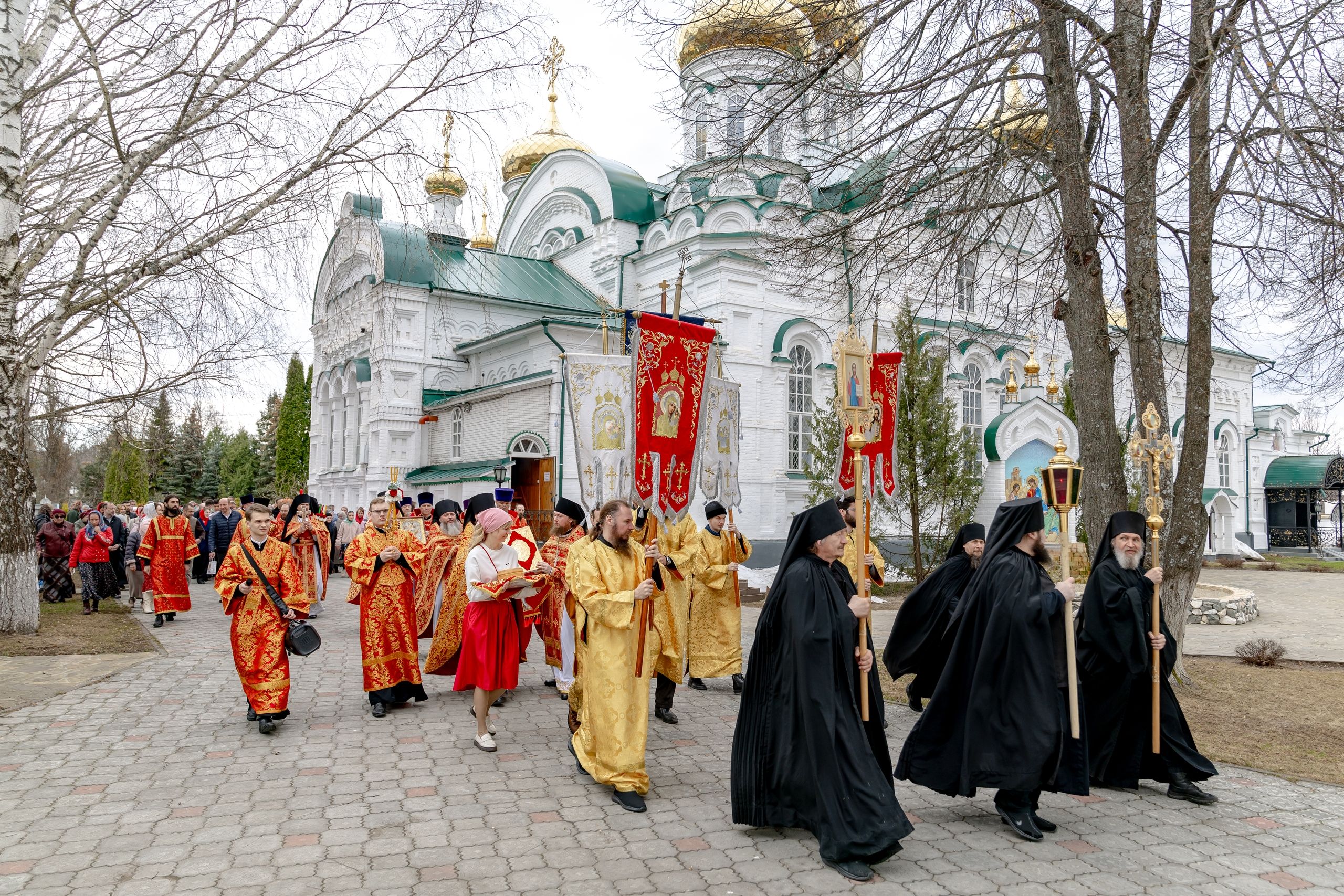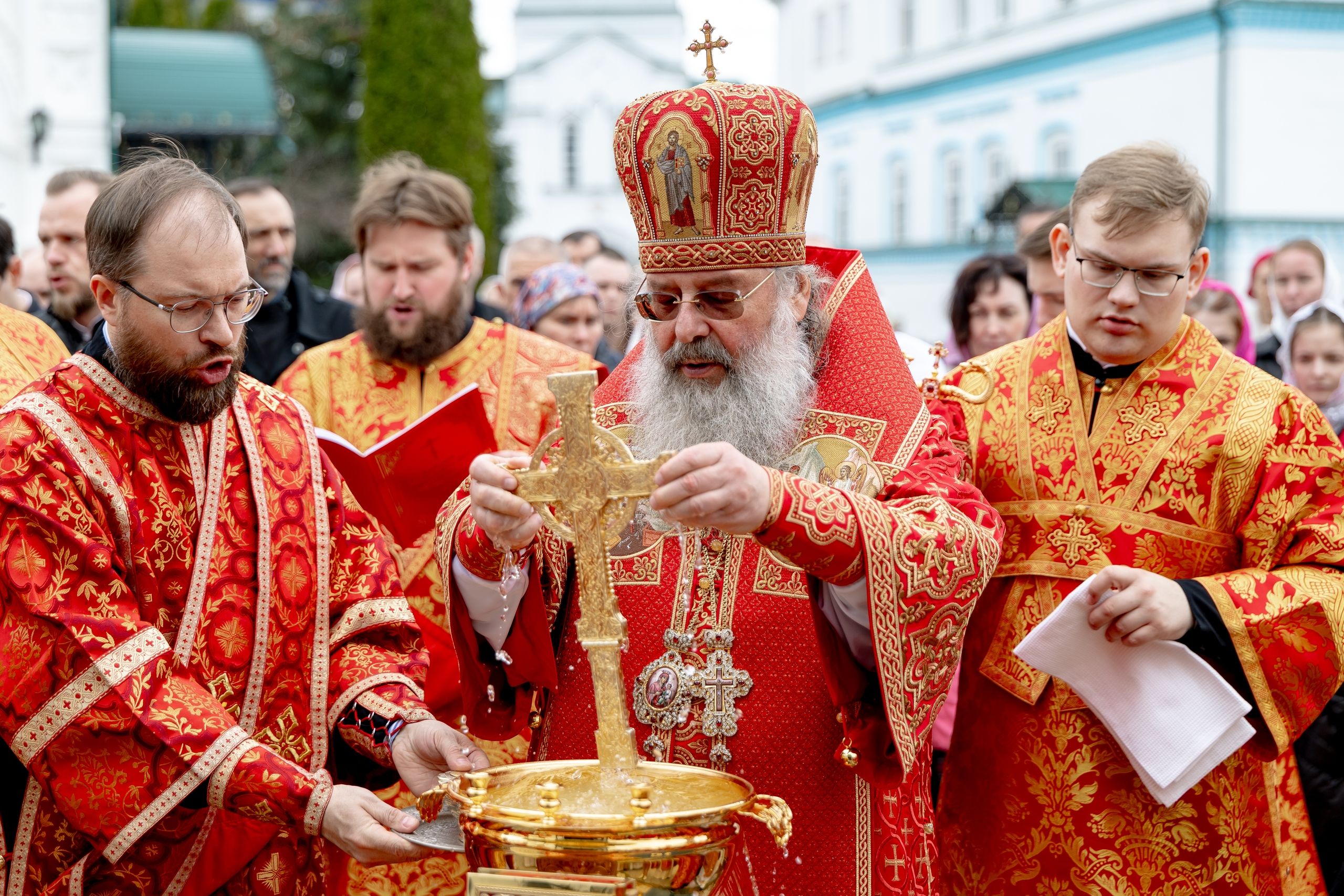 В завершение богослужения духовенство, монашествующие и миряне прошли крестным ходом к водосвятной часовне на соборной площади обители. Там было совершено малое освящение воды.