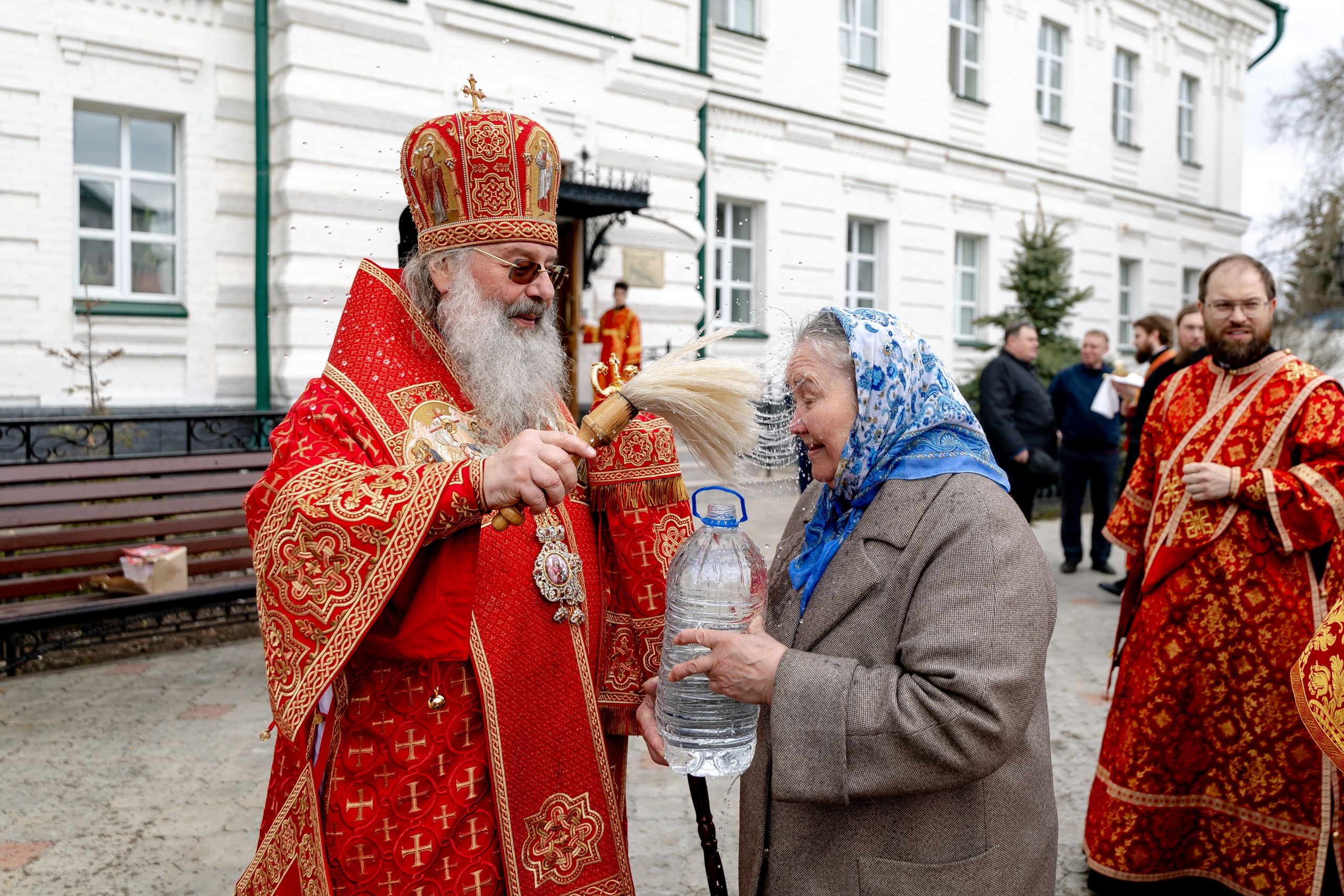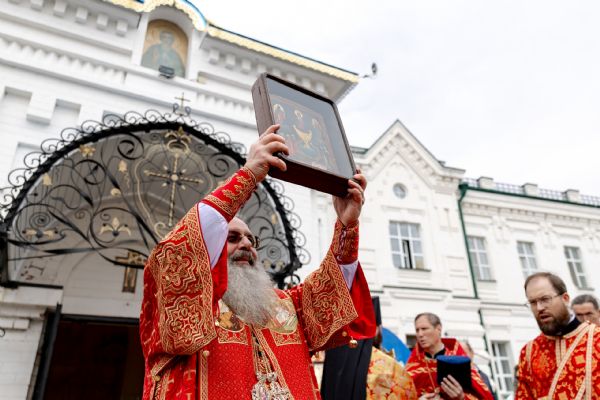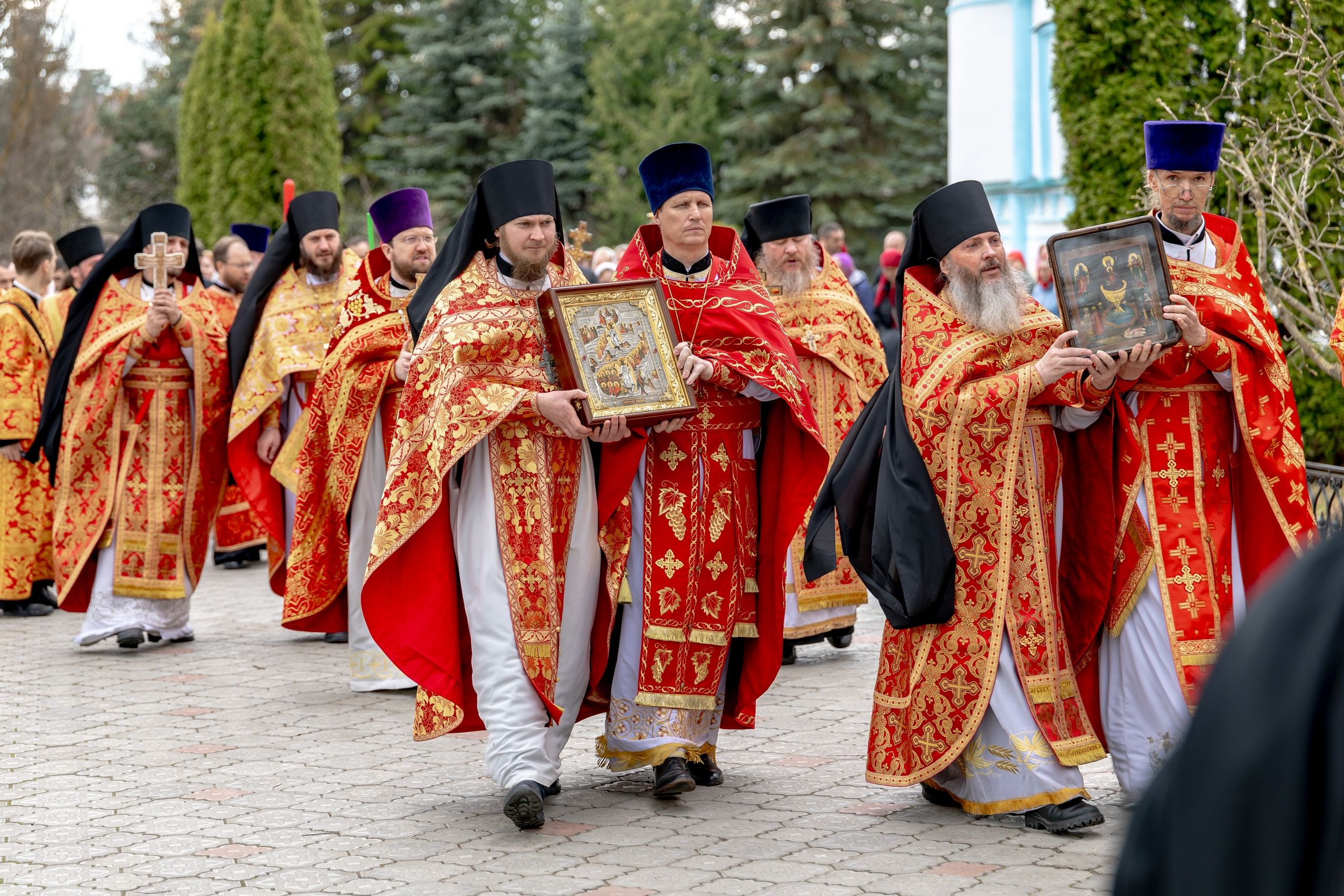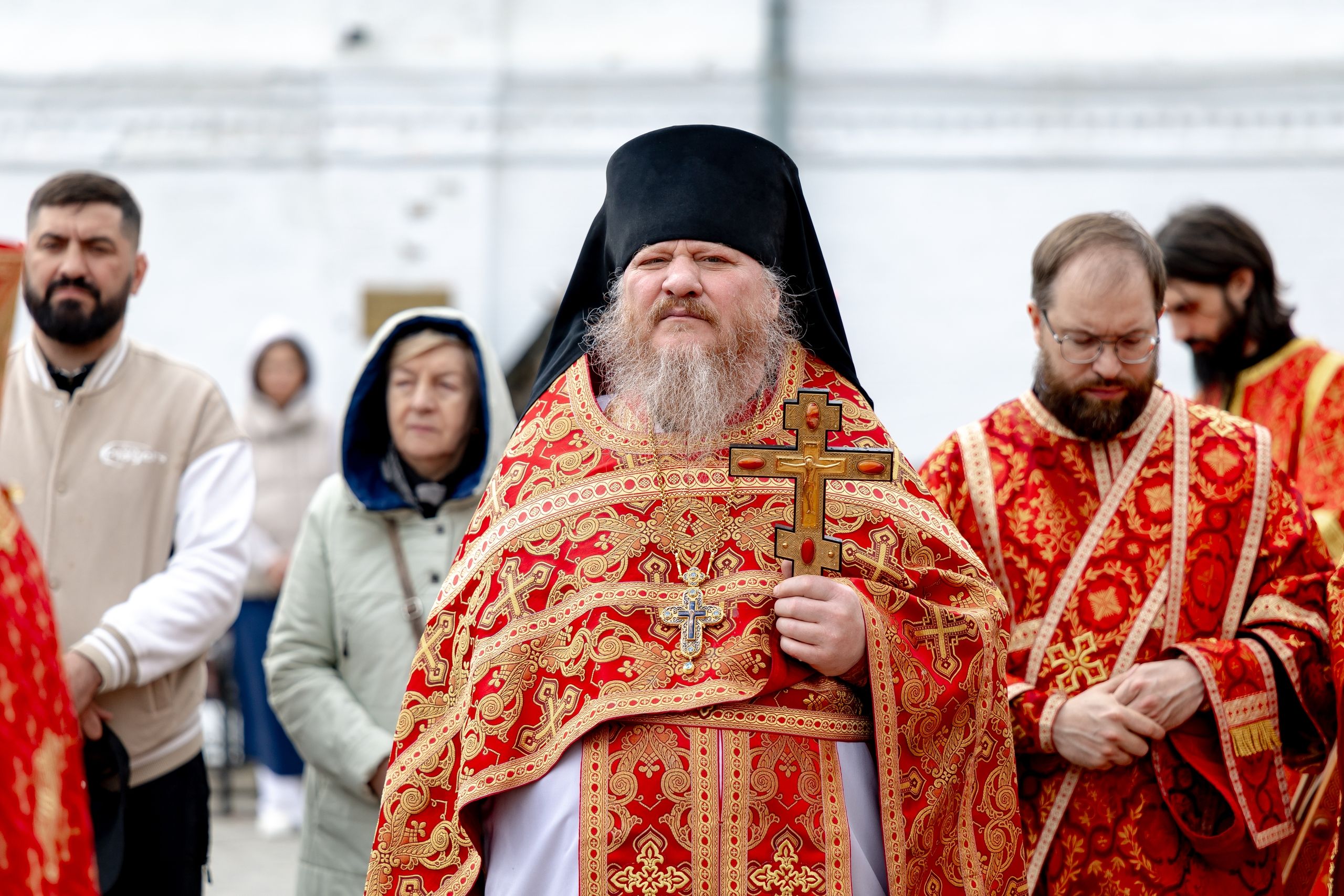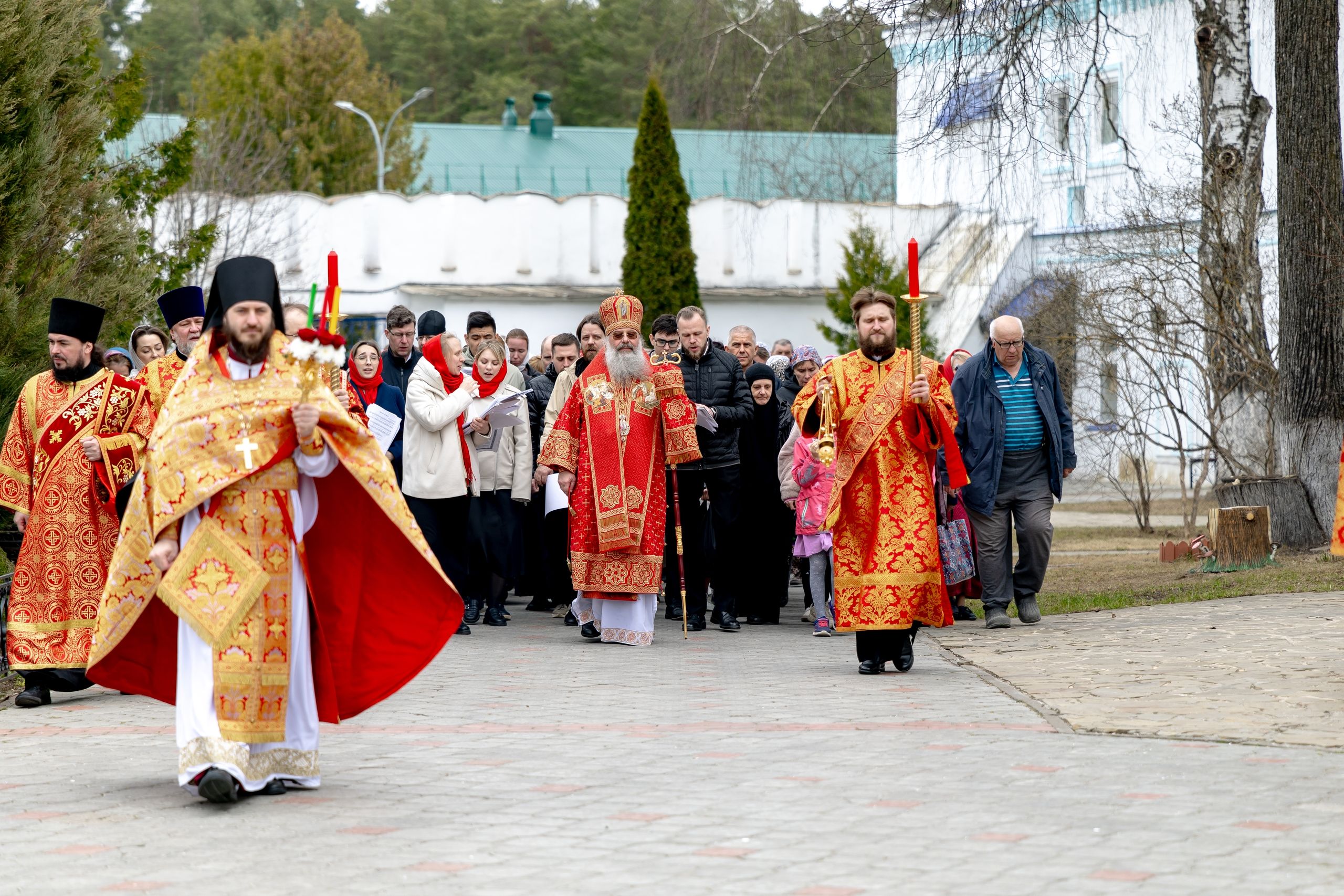 В завершение богослужения духовенство, монашествующие и миряне прошли крестным ходом к водосвятной часовне на соборной площади обители. Там было совершено малое освящение воды.
