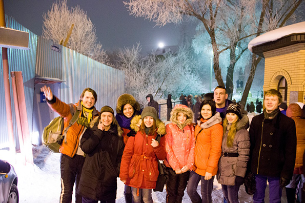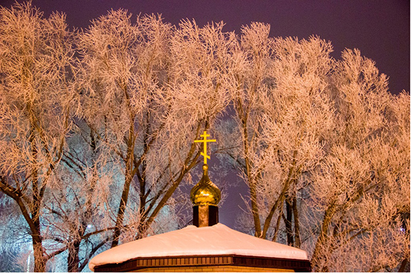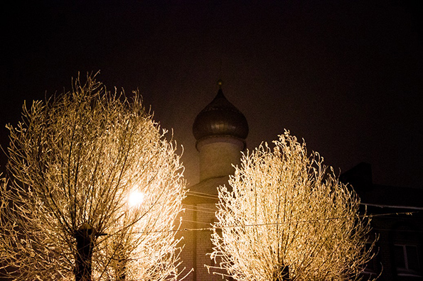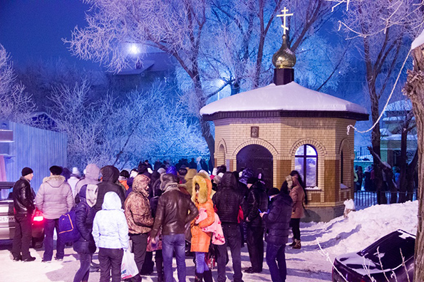 Настроение приподнятое. Дух волнуется. Пейзаж вокруг завораживает. Не припомню, чтобы 19 января да еще вечером было -3° С. Православная молодежь уже около часа стоит в очереди в часовню возле бугульминского Казанского собора. Чтобы согреться, приходится пританцовывать на месте: