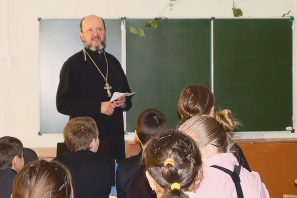 Отец Сергий рассказал школьникам, как живут люди в Краматорске сейчас и как жили в мирное время. Подчеркнул, что каждый человек должен жить по совести, любить свой народ, свою Родину.