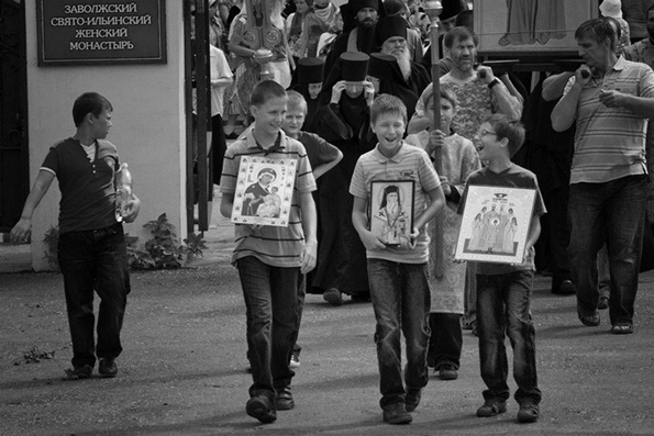Когда я думаю о Боге, я думаю о Дне крещения Руси. Когда отец П. читает проповедь, тьма часовни клубится за его спиной, и темные фигуры святых восстают в золотом сиянии, как молчаливые свидетели, спутники на историческом пути народа. И кажется, что там, в глубине, у теплого огня свечей, собрались еще многие и многие подвижники, рассеянные по нашей стране, по годам и столетиям ее земной жизни.