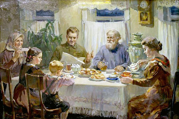 Родное село, люди, весь уклад деревенской жизни, на первый взгляд простой, но на самом-то деле мудрый, нравственно здоровый — все запомнилось навсегда. Глядя на богатое угощенье, почему-то вдруг вспомнилось, как моя большая семья садилась обедать. Пока мама вынимала из большой русской печи чугунок с супом, отец брал в руки круглый каравай хлеба и нарезал большими ломтями. Я проворно шмыгала к высоким полатям и приносила к столу лук и чеснок. Сестрёнка раздавала ложки, и только братишка за всеми наблюдал.