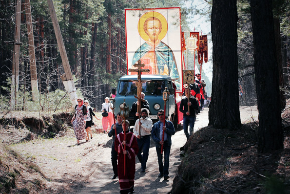 Остался позади город, расступается по-весеннему зеленеющий лес. Длинная вереница людей спускается с высокого откоса навстречу радующей глаз синеве воды, поворачивает налево к месту мученической кончины угодника Божьего. Здесь ежегодно совершается молебен. Верующие набирают живительной воды из родника. Окончен молебен, расходятся люди. Перед глазами ослепительно красивая панорама: отливающие голубизной плесы, изумрудно-зеленые острова... Божия рука и Божие присутствие чувствуется во всём!