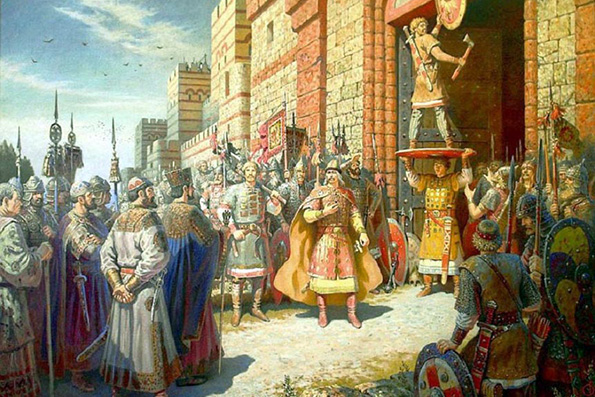 Однако Олега, получившего от византийского императора право именоваться «светлостью», не любили в среде киевских варягов. Он, по мнению киевлян, был конунгом, обманом и силою захватившим киевский престол, и виновным в убийстве Аскольда и Дира. Он — варяг, пришедший из неславянского в народном понимании Новгорода, и пытающийся насадить здесь свои обычаи и традиции. А в средние века обычай — это главный способ формирования связей между людьми. В легенде, блистательно сложенной Александром Сергеевичем Пушкиным, Олег предстает победителем, торжествующим над надменным Константинополем — Царьградом, и прибившим щит к его воротам. Мы не знаем, было это на самом деле или нет, но обычай отмечать победу этим знаком, остававшимся в назидание побежденным, появился позднее IX века. Олег добился главного — мирного договора, который определял условия торговли для обеих сторон и порядок мореплавания. Киевская Русь получила выгодные условия для взаимодействия с Византией.