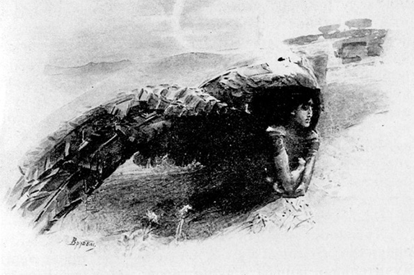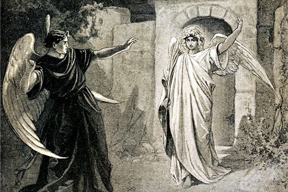 И все же он входит к Тамаре, исполненный опять надежд на лучшее, «с душой, открытой для добра», но видит у ее изголовья охраняющего ее Херувима. Ангел гонит Демона прочь, но тот не готов уступить Тамару: «и вновь в душе его проснулся старинной ненависти яд». И здесь мы на мгновенье видим его истинное обличье, обличье злого духа. И после этого в клятвы, которые он приносит девушке, уже невозможно поверить. А обещает он ей то, что она хотела бы от него услышать:
