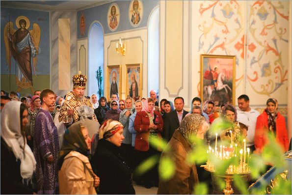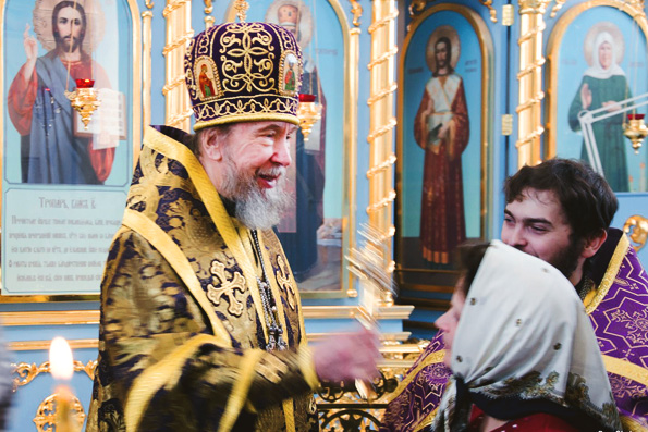 В храме в этот день все было чинно, благоговейно — повсюду иконы с зажженными свечами и лампадами, цветы и ковровые дорожки. Но особенно радовало то, какие у людей были серьезные лица, настроенные на глубокую молитву. А ведь настрой этот шел, в первую очередь, от Владыки, от его внутренней сосредоточенности в молитве. Возникала уверенность, что он не просто читает слова молитвы, а беседует с Богом, восхваляя и прославляя Его. И настрой этот неизъяснимым образом передавался и нам, прихожанам храма. Этот общий молитвенный подъем помогал каждому из нас полнее ощутить ту благодать, которая ощущалась в архиерейском богослужении. Ведь ни для кого не секрет, что, зачастую, выстоять всю службу в храме достаточно нелегко: притупляется внимание, мысли начинают рассеиваться, и порой перестаешь даже вслушиваться в слова молитвы. А тут… все слова молитв как-то легко ложились на сердце, и никакой рассеянности и усталости не было и в помине. Наоборот, душа и сердце ликовали: и от того, что сподобились молиться с самим архиереем, и от того, насколько торжественным и проникновенным было все богослужение. От всего этого ощущалось внутреннее ликование и умиление, и та благодать, которая снизошла на меня в этот памятный день, еще долго была в моем сердце и душе.