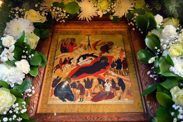 «Дева днесь Пресущественнаго раждает, и земля вертеп Неприступному приносит…», — вспоминаются слова праздничного рождественского песнопения. Взгляд скользит по многоголовому потоку прихожан, плотно, до сантиметра заполнившему пространство храма, и застывает на иконе. Возлежащая на алом ложе Божия Матерь, облаченная в багряно-коричневую ризу — ее главный изобразительный акцент. Гибкая певучая линия фигуры Девы Марии доминирует даже над образом черной глубины вифлеемской пещеры, поглотившей крошечного спеленутого Богомладенца.