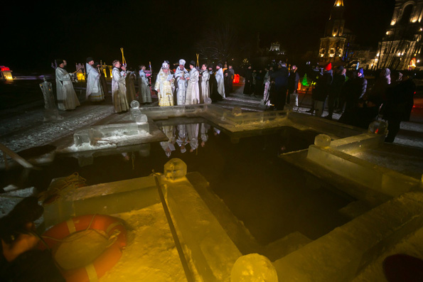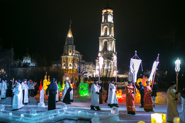 Все проходит четко и организованно, и вот уже владыка Феофан занимает место возле ледяного аналоя, начинается водосвятный молебен, митрополит читает строчки из Евангелия от Марка, ему дают в руки золотой крест на белой атласной ленточке, он трижды погружает его в воду. Озерная вода освящена! Ночь стоит теплая, метель стихла, торжественно поет стоящий на льду монастырский хор, подсвеченный разными цветами ледяной городок кажется хрустальным.