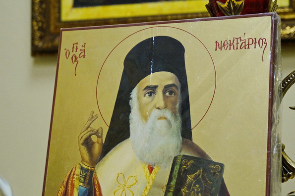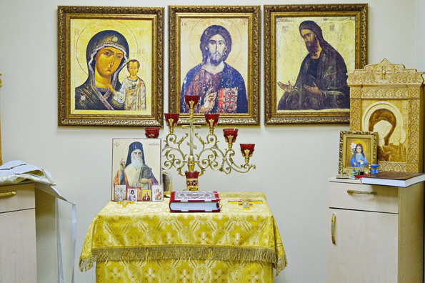 В комнатке-храме стоит переносной престол, на стене висят образ Божией Матери «Всецарица», а также иконы великомученика и целителя Пантелеимона, и недавно прославленного греческого святого Нектария с острова Эгина.