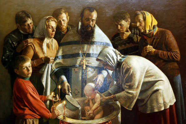 ...Вода, приготовленная для Крещения освятилась молитвою и троекратным священническим на нее дуновением... «Крещается раб Божий... во имя Отца и Сына и Святого Духа, аминь»... Крещаемый умирает для жизни греховной и спогребается со Христом для того, чтобы жить с Ним и в Нем...