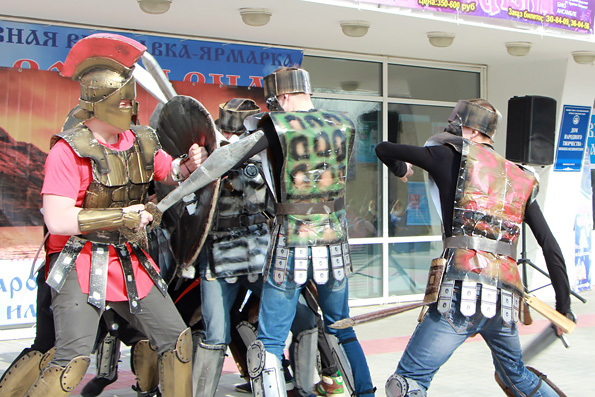 В Нижнекамск ребята ехали с миссией. Они везли городу необычный подарок — театрализованное представление, реконструкцию исторического сражения «300 спартанцев». Наших мальчишек они брали в помощники: теперь в нашем архиве есть фото Федора, Ильи и Артура, облаченных в боевые доспехи древнеперсидских воинов. Единственного женского персонажа постановки — прекрасную царицу Горго — сыграла Катя.