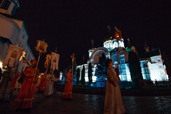 С высоты колокольни льется ликующий пасхальный трезвон. Все молящиеся идут с возожжёнными свечами, выражая этим духовную радость светоносного праздника. Шествие останавливается у затворенных западных врат храма, как бы у запечатленного гроба Христова. И здесь священник, подобно Ангелу, возвестившему мироносицам у гроба о Воскресении Христовом, первый возглашает радостную песнь: «Христос воскресе из мертвых, смертию смерть поправ, и сущим во гробех живот даровав!». Затем предстоятель возглашает стихи древнего пророчества: «Да воскреснет Бог и расточатся врази его…», а хор и все люди в ответ на каждый стих поют: «Христос воскресе из мертвых…».