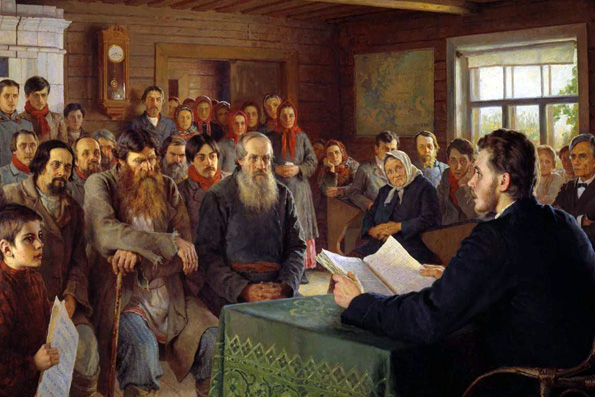 — Но ведь не все же тогда собирались на маёвки, — возразила Ольга Михайловна. — Вот, посмотрите — картина академика Николая Петровича Богданова-Бельского, тоже про воскресенье и тоже как бы снимок из тех лет. Ведь тут прямо документ: изображены реальные жители подмосковного села Татево в имении профессора Рачинского — он в галстуке-бабочке — послушать, что им прочитает семинарист о духовной жизни. И какие разные лица! И какой неподдельный интерес!