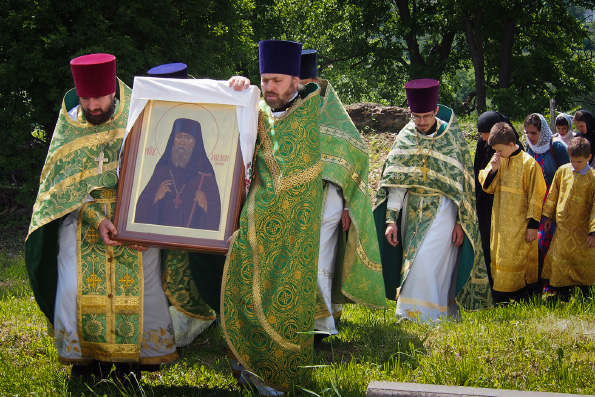 Всенощное бдение совершается особенно торжественно и в большей части на открытом воздухе. Помню, приближается время литии. Диакон начал говорить просительную ектенью. Монастырское и приезжее духовенство облачается в новые ризы. Но вот конец ектении, далее следует возглас священника и затем царские врата широко растворяются. Из алтаря выходит с жезлом в руке молодой, представительный архимандрит Петр, — за ним стройными парами духовенство. Два иеромонаха берут на руки Тихвинскую чудотворную икону Божией Матери и становятся впереди духовенства. В таком виде открывается шествие вокруг церкви. На монастырском дворе море голов. Четыре раза останавливается крестный ход; всякий раз диакон возглашает: «рцем вси, Господу помолимся», а архимандрит Петр осеняет крестом и кропит святой водой. Наконец, ход возвращается в храм. Здесь, пред началом шестопсалмия, выходит на амвон протоиерей и говорит народу одушевленное слово об отце Макарии, его святой жизни и тех чудесах, которые со дня его кончины и до настоящего времени совершаются в народе.