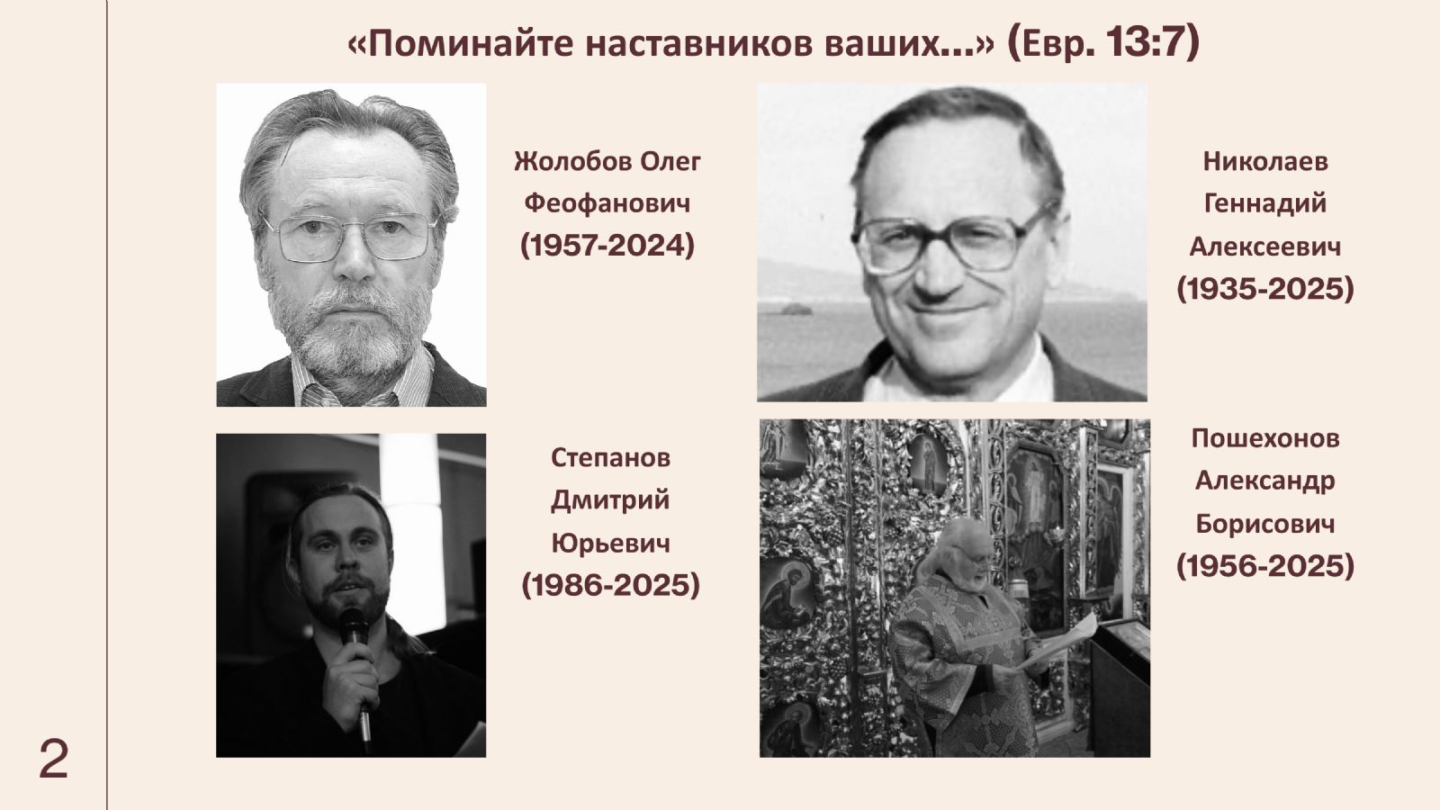 Прежде всего, следуя словам апостола Павла: «Поминайте наставников ваших…» (Евр. 13:7), вспомним тружеников на ниве Христовой, отошедших ко Господу в минувшем периоде.
