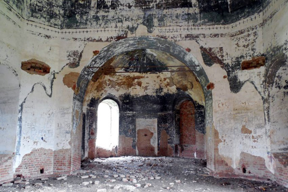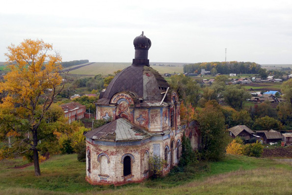 Небольшая сельская церковь в псевдорусском стиле, выделяющаяся выразительной постановкой на рельефе. Церковь имеет симметрично-осевую композицию. Храмовая часть — двусветный четверик со срезанными углами под сомкнутым восьмигранным сводом с четырьмя люкарнами в основании. Маленькая главка посажена на глухой круглый барабан. Апсида пятигранная, с окнами на каждой грани, трапезная в два окна. Все входы и оконные проемы имеют арочную форму, в простенках пилястры. Колокольня утрачена.