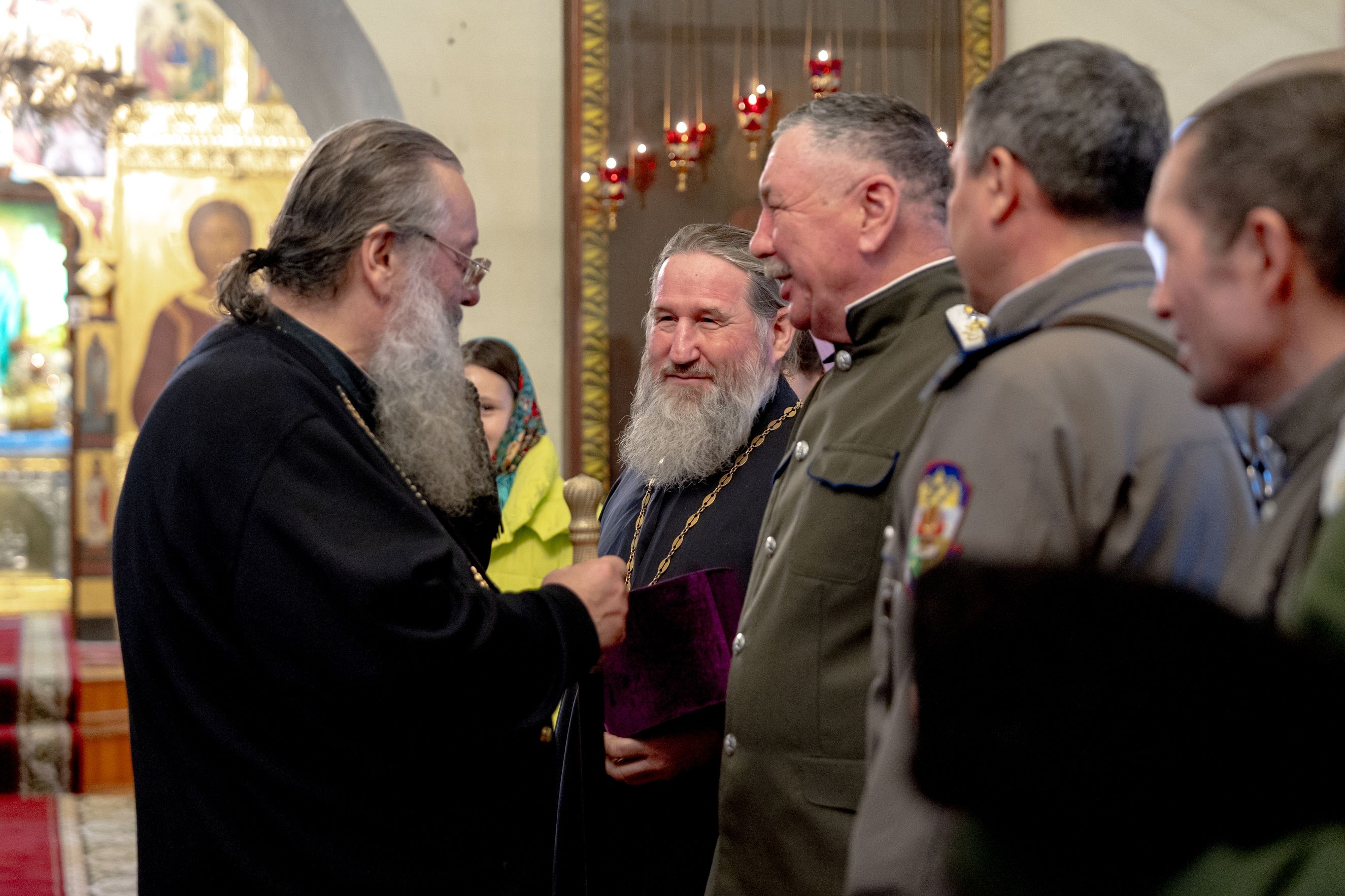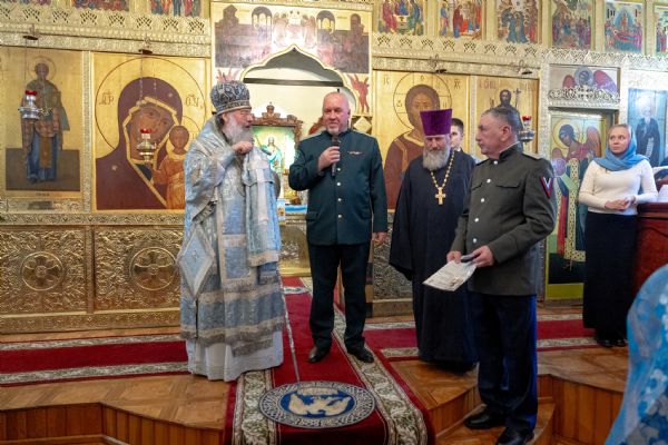 Архипастырь также сугубо приветствовал атамана Василия Филиппова. В свою очередь войсковой атаман поздравил главу Татарстанской митрополии, духовенство и верующих с праздником. По поручению верховного атамана Союза казаков России казачьего полковника Павла Задорожного Василий Филиппов вручил митрополиту Кириллу серебряную медаль «Атаман Дутов Александр Ильич». Также представитель оренбургского казачества наградил игумена Алексия (Яцейко) медалью «Алексий, человек Божий».