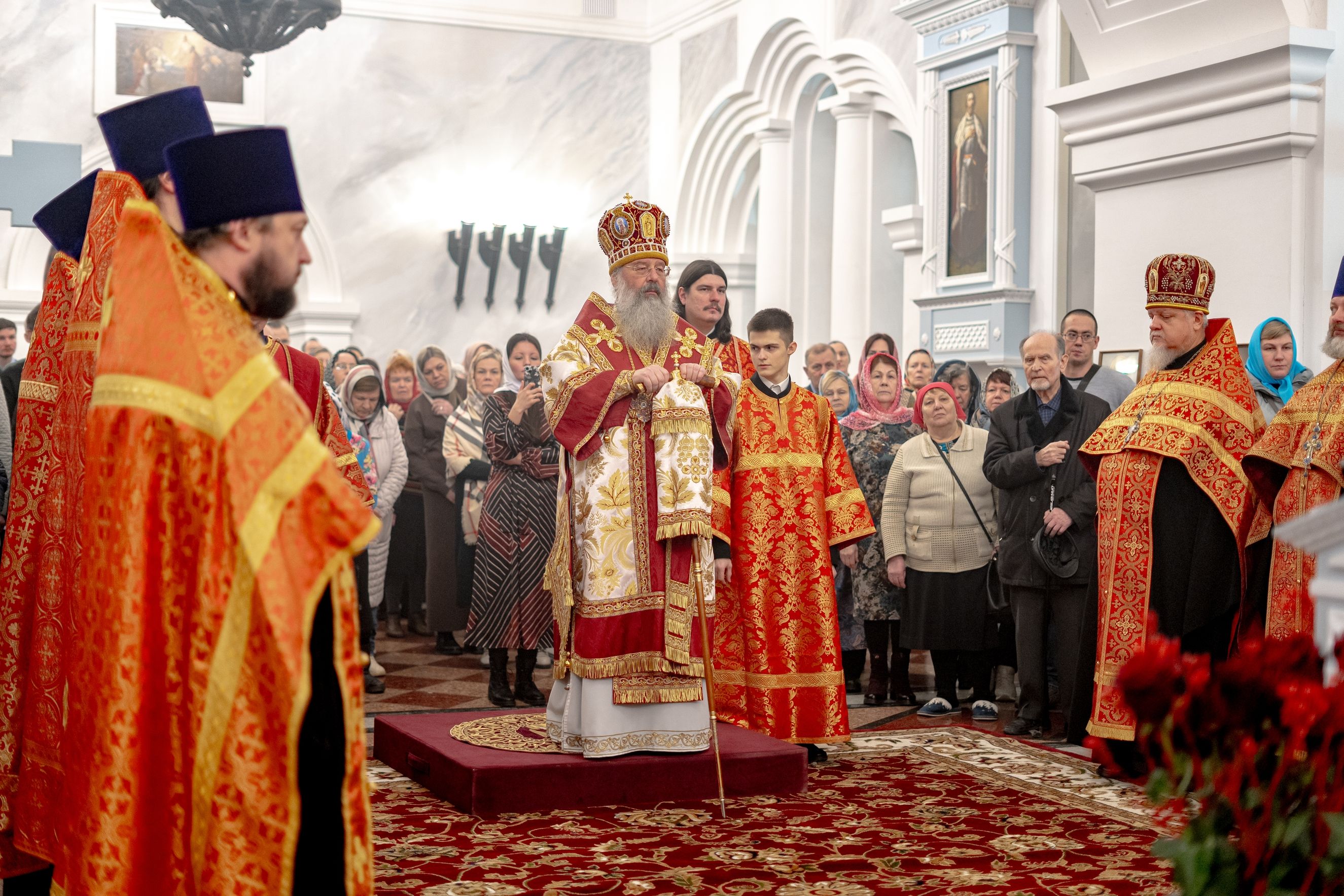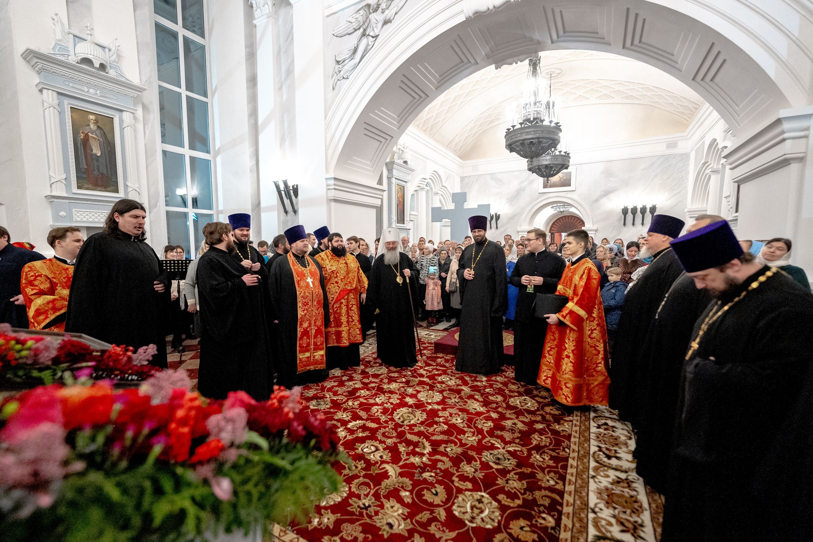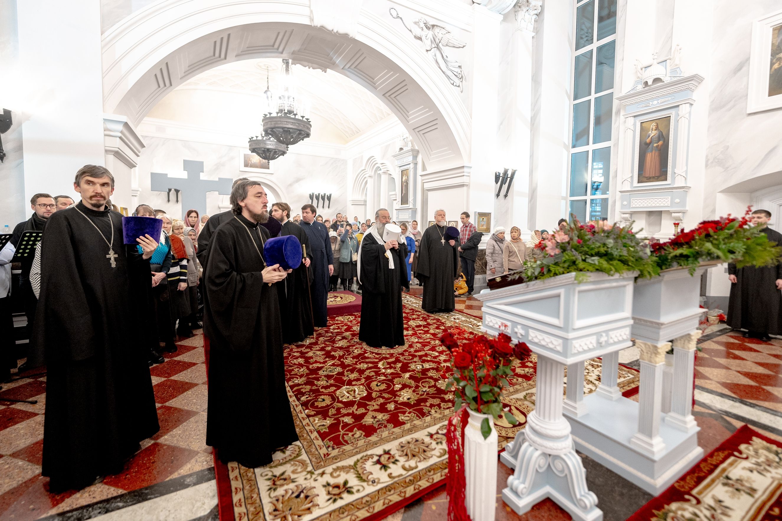 Его Высокопреосвященству сослужили секретарь Татарстанской митрополии иеромонах Кирилл (Корытко), благочинный I Казанского округа протоиерей Владимир Самойленко, настоятель храма протоиерей Владимир Пономарёв, благочинный III Казанского округа протоиерей Алексий Краевский, ректор Казанской духовной семинарии, настоятель храма в честь праведного Иоанна Кронштадтского города Казани иерей Никита Кузнецов, настоятель Иоанно-Предтеченского монастыря города Казани игумен Алексий (Яцейко), настоятель Никольского храма посёлка Константиновка иерей Александр Данилов, клирики прихода.